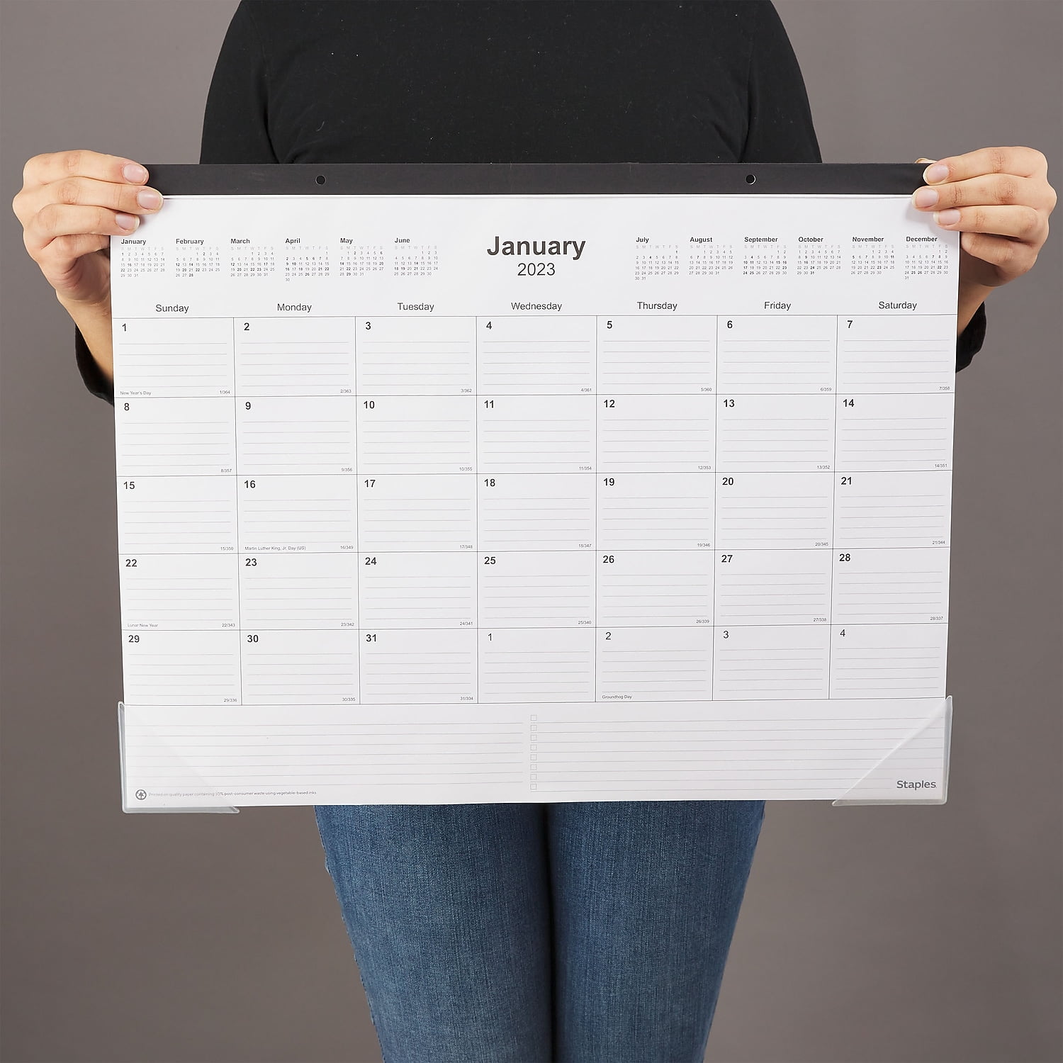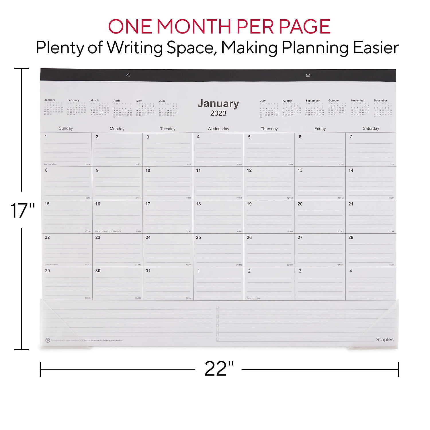 Ensure your schedule is in front of you with this Staples 17 x 22-inch desk pad calendar.Write down appointments in this desk pad calendar. The black and white design delivers a professional look, while the horizontal pattern lets you easily view written notes. Featuring a glue top-bound construction and poly cover, this calendar offers durability. This Staples 17 x 22-inch desk pad calendar has extra rulings at the bottom for making the most of your monthly layout space. Dimensions: 17"" x 22"". January 2023-December 2023 desk pad calendar. Monthly calendar in black and white colors. Comes in landscape orientation. Features additional space for notes and to-do lists on each page. One month per page allows you to keep notes and organization neatly aligned and provides plenty of writing space, making planning easier. Sold as 1 Each.