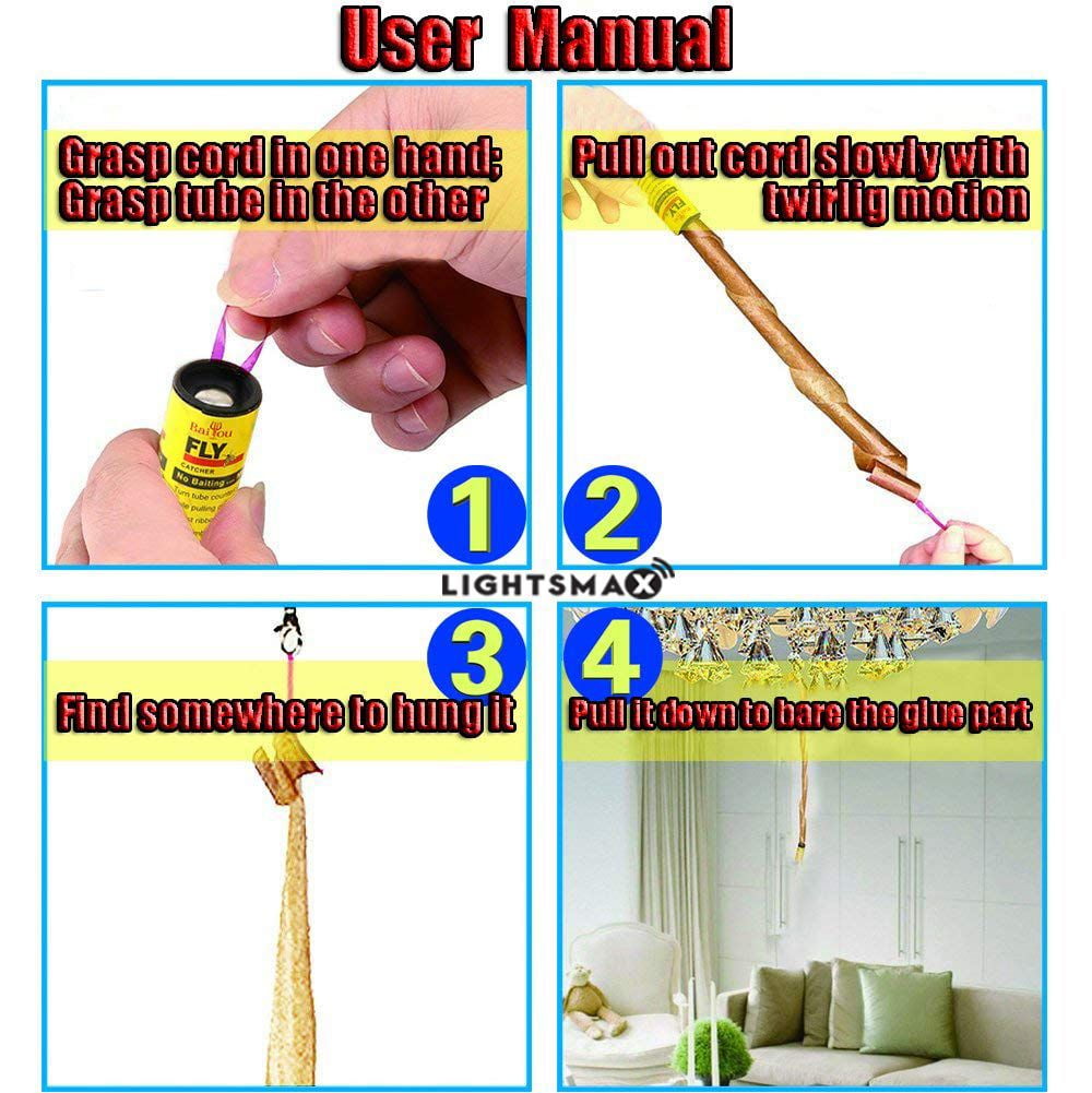 Sticky fly ribbon: spread out the size: 5*68 cm, 32 pack LIGHTSMAX fruit fly traps for kitchen, large and cheap, long lasting. The fly traps: hang the fly strips indoor where there are many flies, the sticky glue will stick them and keep the flies from escaping. The higher the temperature, the effect is better. Safe and no-odor: this fruit fly trap is made of super thick glue and waterproof paper. No chemicals or poisons, no smoke, no chemical odor, no pollution. Use attention: dual-sided sticky, please be careful when pulling to avoid breakage. The fly strips is sticky. Be careful it stick to your hand. Notice: as the weather gets hot, the gel melts, the red hanging ribbon easy pulls right off. We suggest you prepare a rope and a pair of scissors, when a small amount of sticky paper is pulled out, poke a hole in the paper with a pair of scissors and tie your rope, at last, pull the rest out cord slowly while turning tune in a counterclockwise(twirling)motion. Or nail the sticky paper directly to the wall. It’s easier to refrigerate for a while before using it!