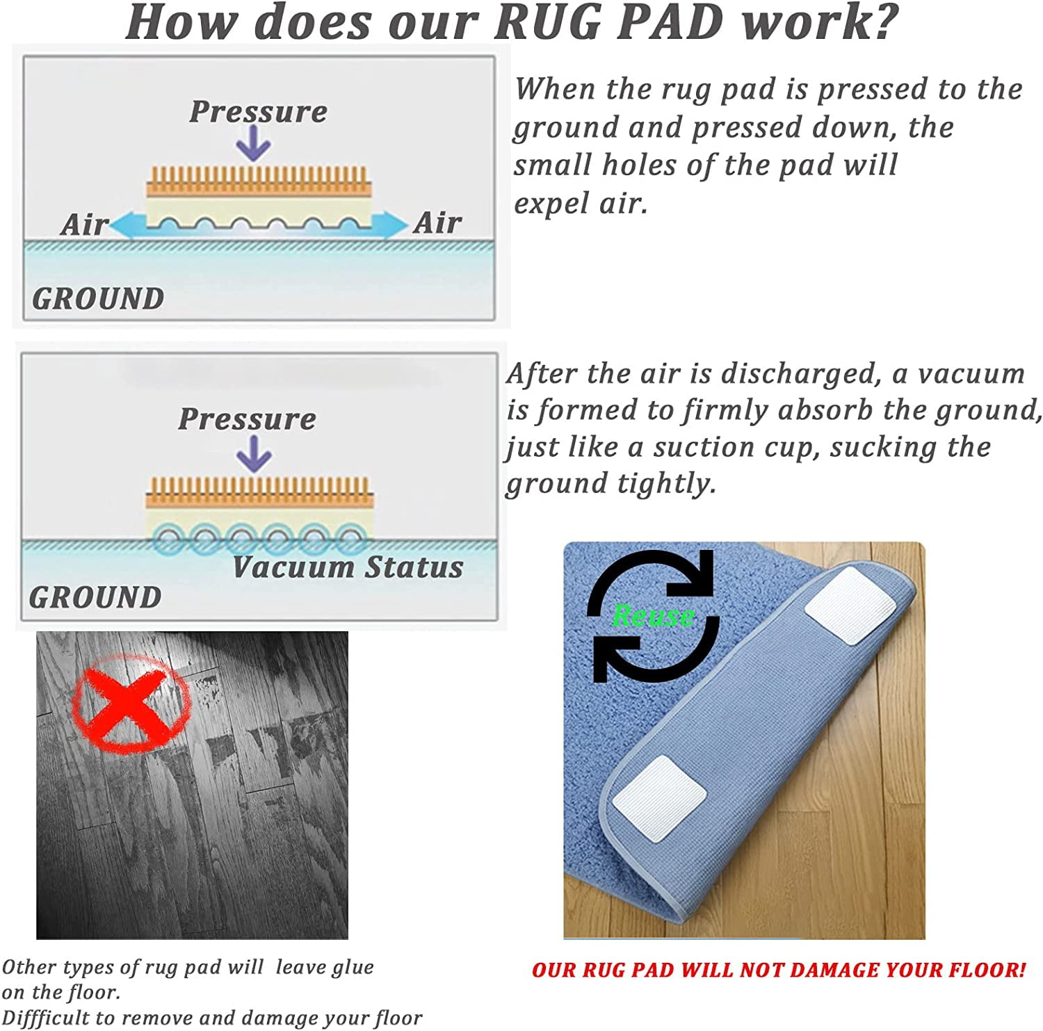 - 【Keep the carpet fixed】Rug grippers for hard floors help to keep your rugs in place and prevent corner curling; designed with a strong and dual-sided adhesive grip; easy to apply to the underside of rugs and the topside of floors to help rugs stay in place and flat.