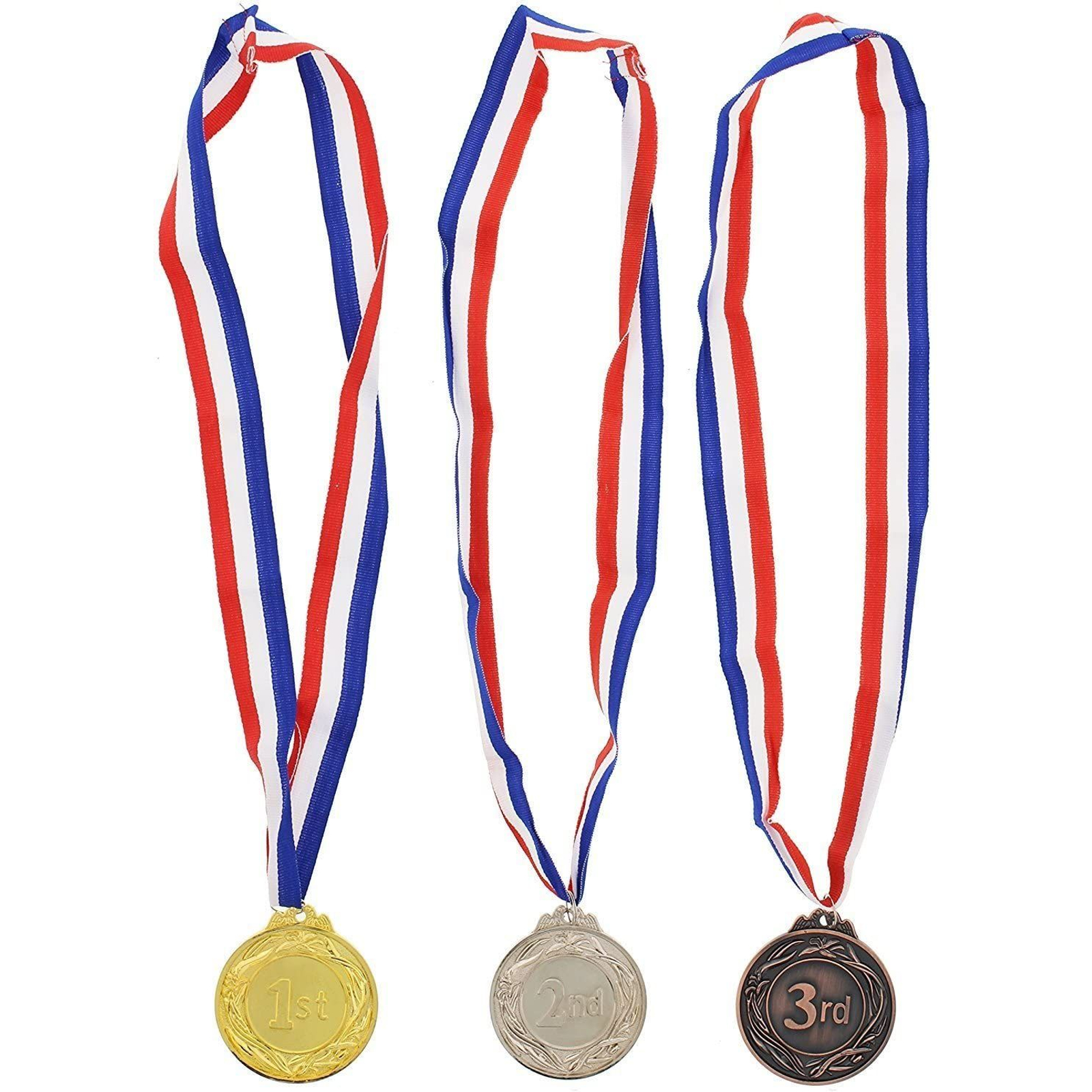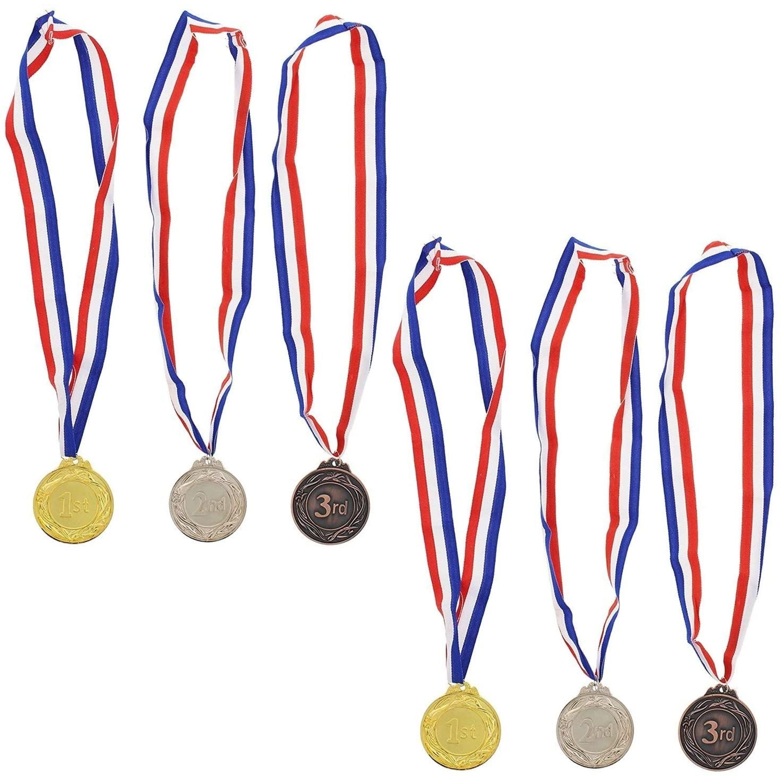 Includes 6 medals two of each 1st. 2nd, and 3rd place colored appropriately gold, silver, and bronze made of sturdy metal. Each medal comes with a traditional red, white, and blue v-neck shaped ribbon. Great use for any event or competition a stellar reward for the winning performance. Great award for both athletics and academics.