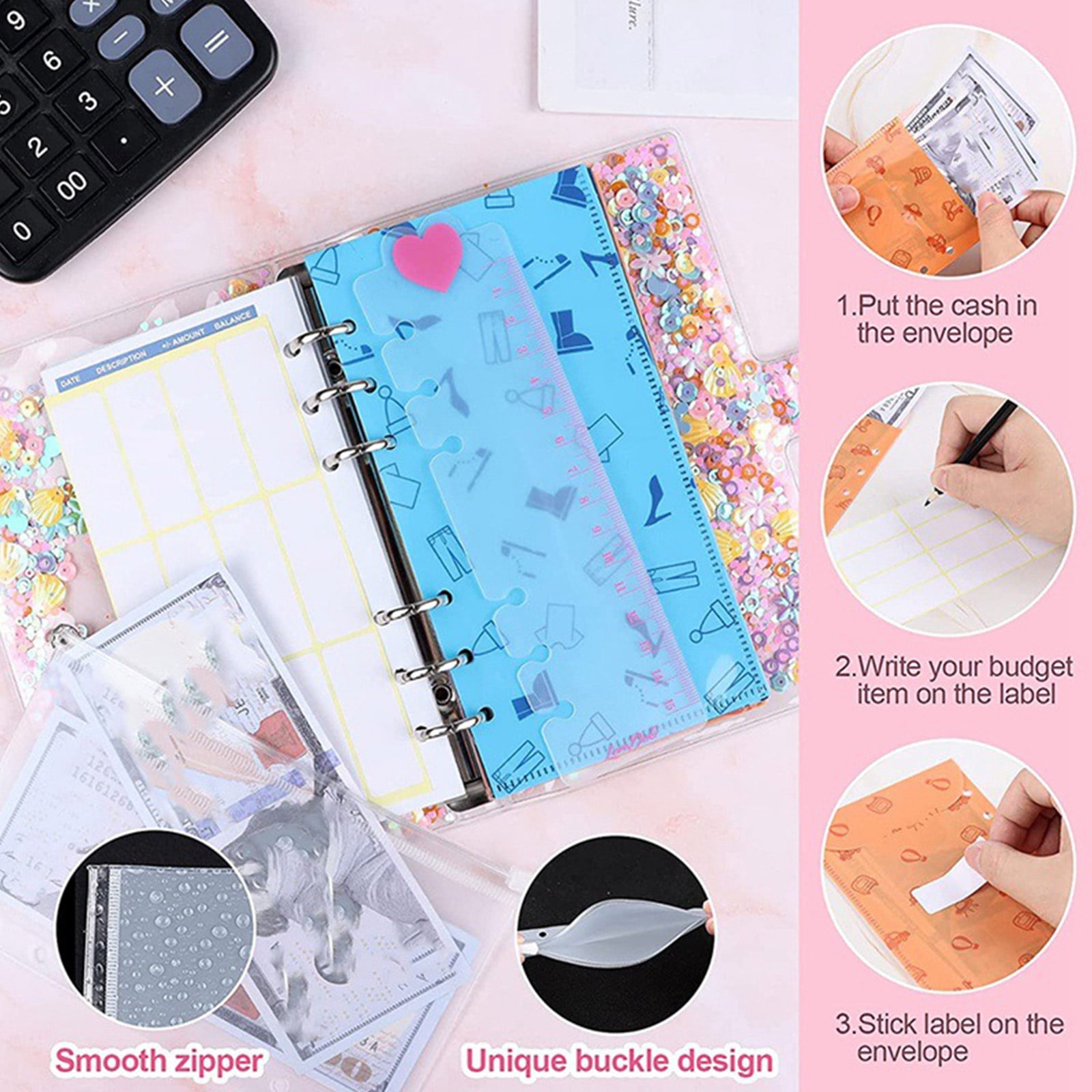 Wide usage: The product contains 1 Piece Sequins Loose-leaf Cover + 12 Pieces Blue Budget Sheets +12 Pieces PVC Budget Envelopes+1 Piece Heart Ruler +1 Piece Clear Zipper Bag +2 Sheets Blank Stickers. Suitable for school, office, travel and family as a money organizer for cash.