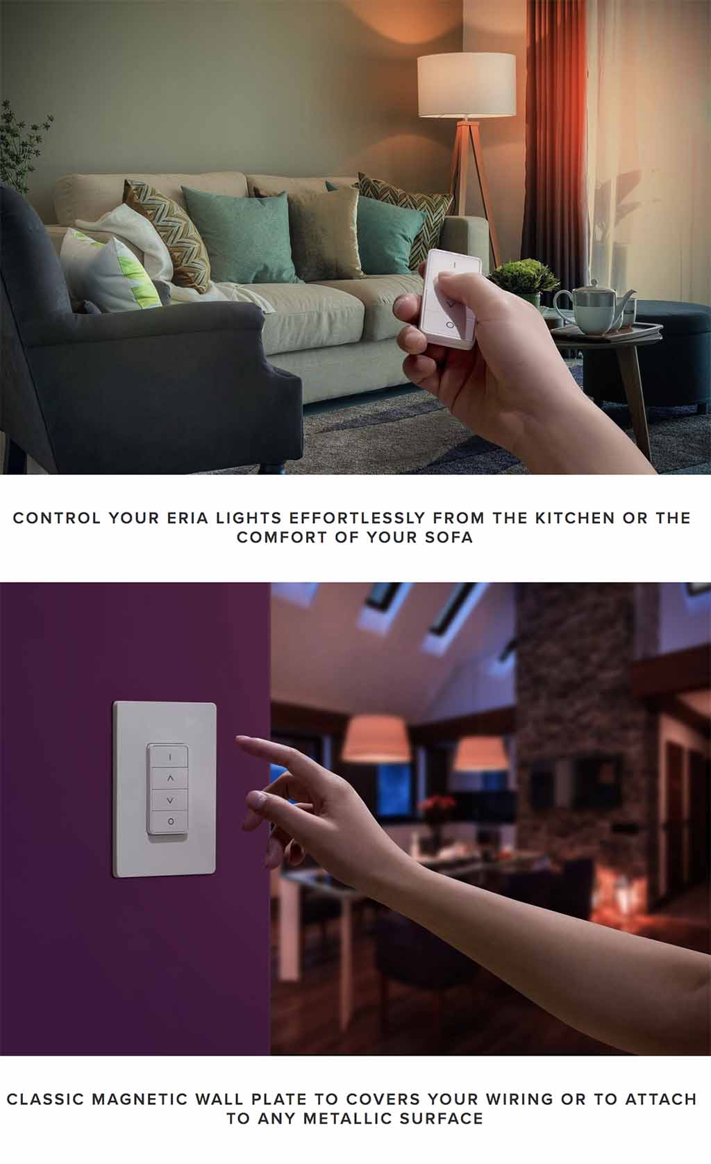 Complete wireless dimming starter kit. Comes with everything you need to control your lighting effortlessly from the kitchen to the comfort of your sofa by using the ERIA wireless dimming switch. Our starter kit comes with one pre-programmed A19 soft white 800 lumen wireless controlled smart bulb and one portable dimmer remote to give you control from anywhere in your home up to 90 feet with no hub required. Easy to use, easy to install, and works with any ZigBee certified light. Connect to an AduroSmart ERIA hub for total smart home integration.AduroSmart ERIA Soft White Smart Wireless Dimming A19 Starter Kit, 60W Equivalent, Remote Switch Included, 1 Bulbs