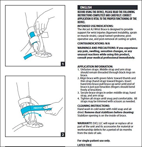 Aircast A2 Left Wrist Brace with Thumb Spica supports a wide range of wrist injuries. Dual removable stabilizers, one dorsal and one volar, help control the movement of the wrist and allow full dexterity of the finger. Adjustable straps allow for a personalized fit, while the contoured shape and cool, dry, breathable material ensure comfort. The A2 Wrist Brace with Thumb Spica provides additional thumb support for thumb injuries. Indicated for wrist ligament instability, sprain or muscle strain, control of carpal tunnel syndrome, post-op and post removal of casting or sprain, thumb injuries.1 Each. Measurement: 12.7-16.5cm / 5" – 6.5"
