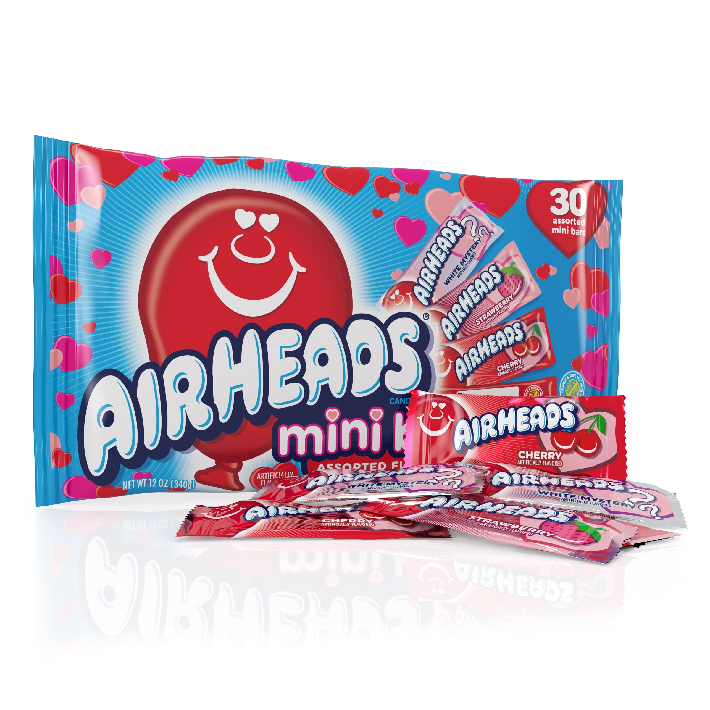 Candy, Assorted, Mini, Bag 30 CT Out of control. Artificially flavored candy. Manufactured in a facility that processes wheat flour. 30 bars [12 oz (342 g)] Erlanger, KY 41018Airheads Mini Valentine Laydown Bag