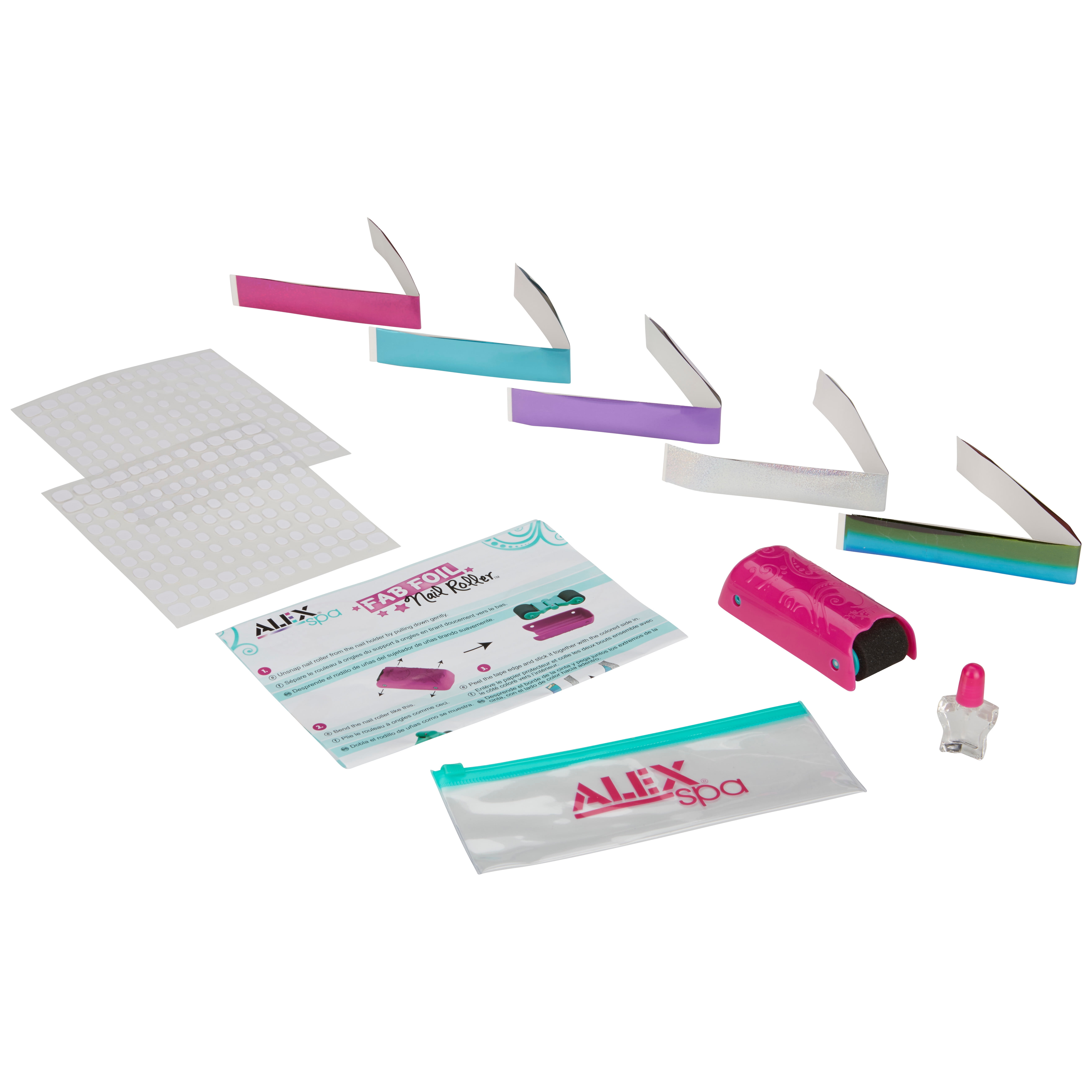 ALEX Spa Fab Foil Nail Roller puts sparkly color right on your nails without using a brush. Just roll on some color, decorate with a sticker and brush on some topcoat to protect. Create shiny two-tone effects by rolling on a second color! Includes nail roller, 30 foil strips, clear nail polish 0.17oz. (5ml.), 2 sheets of adhesive double sided nail stickers 5.5in. x 6.5in. (14.5cm. x 16.5cm.), storage pouch and easy instructions. Recommended for children 8 years of age and older.