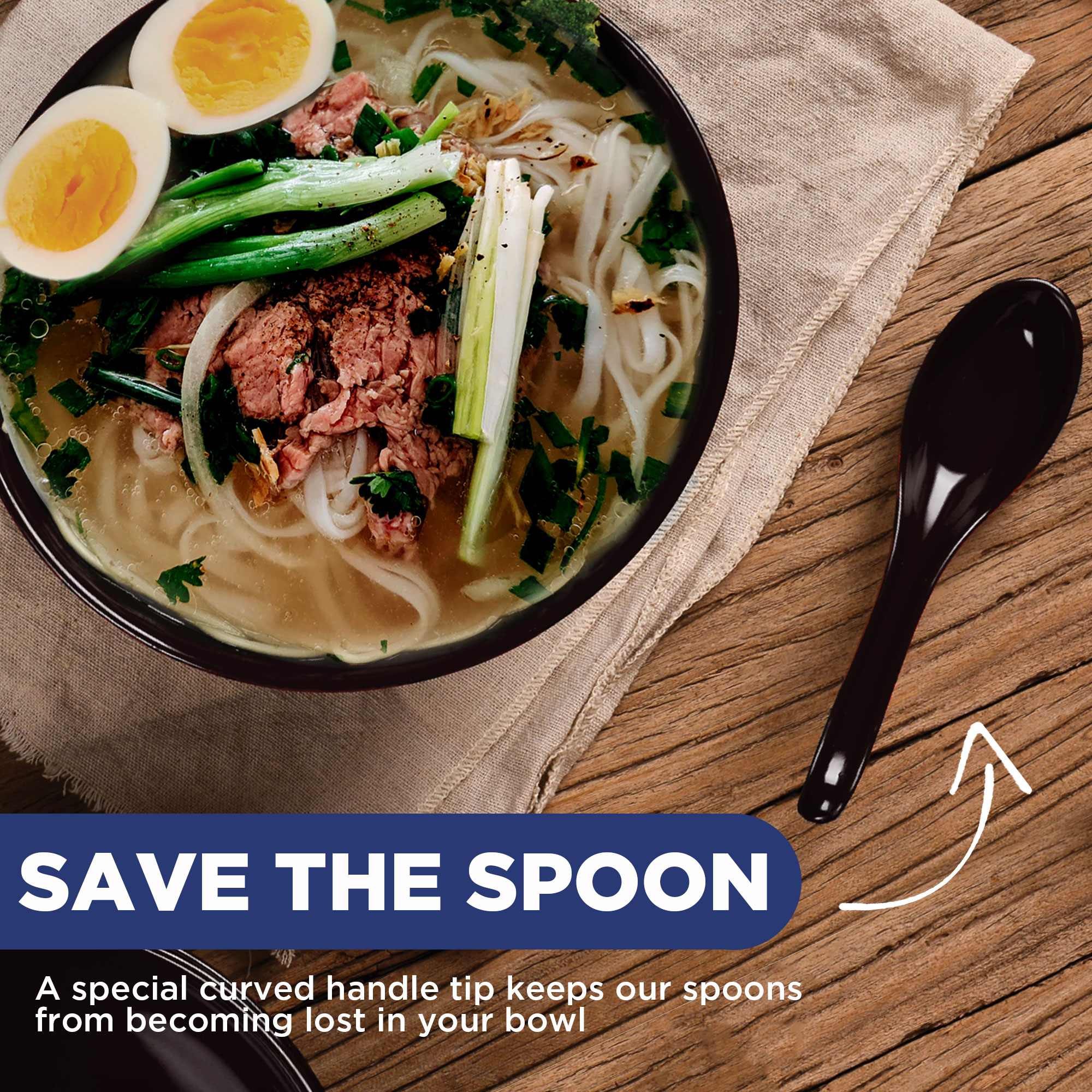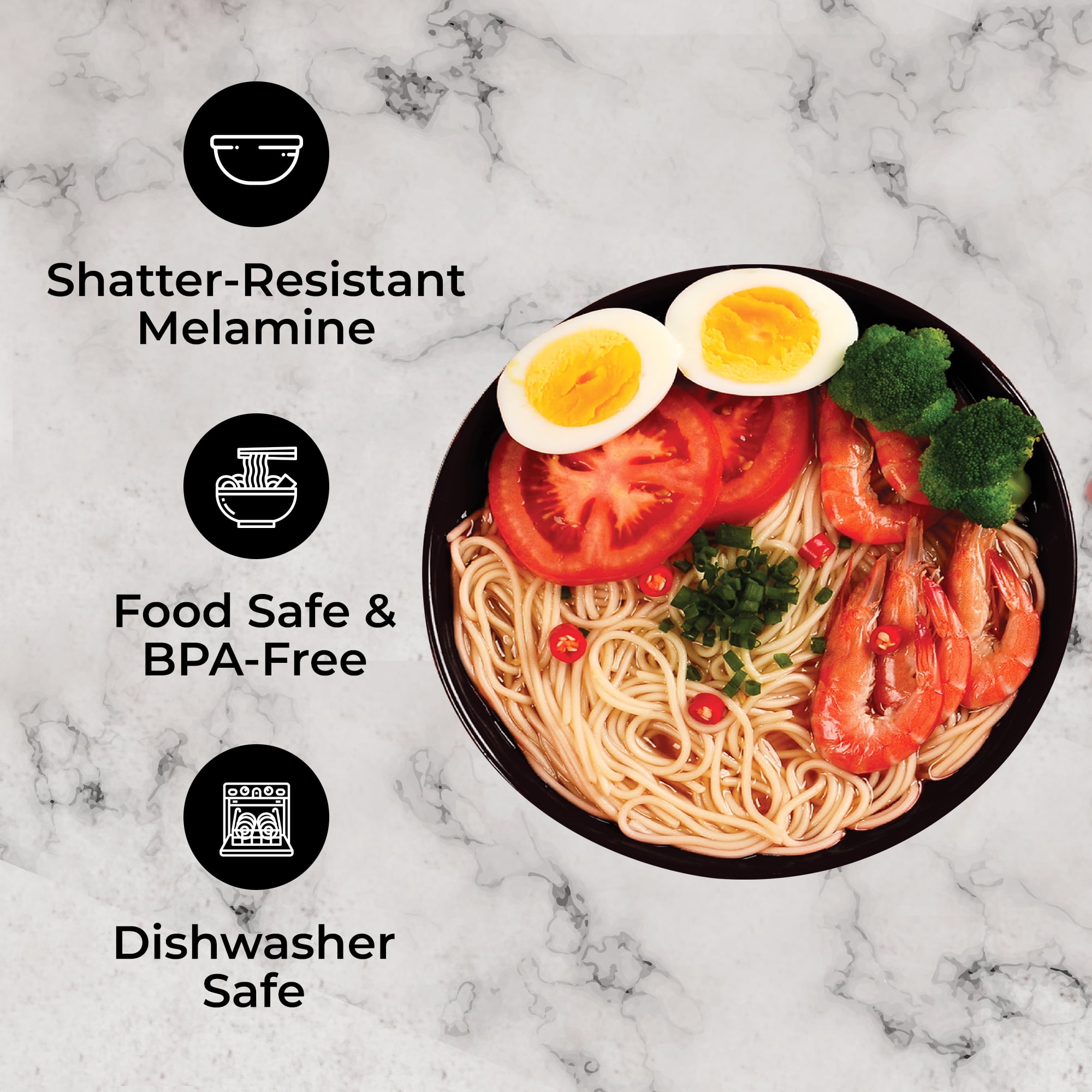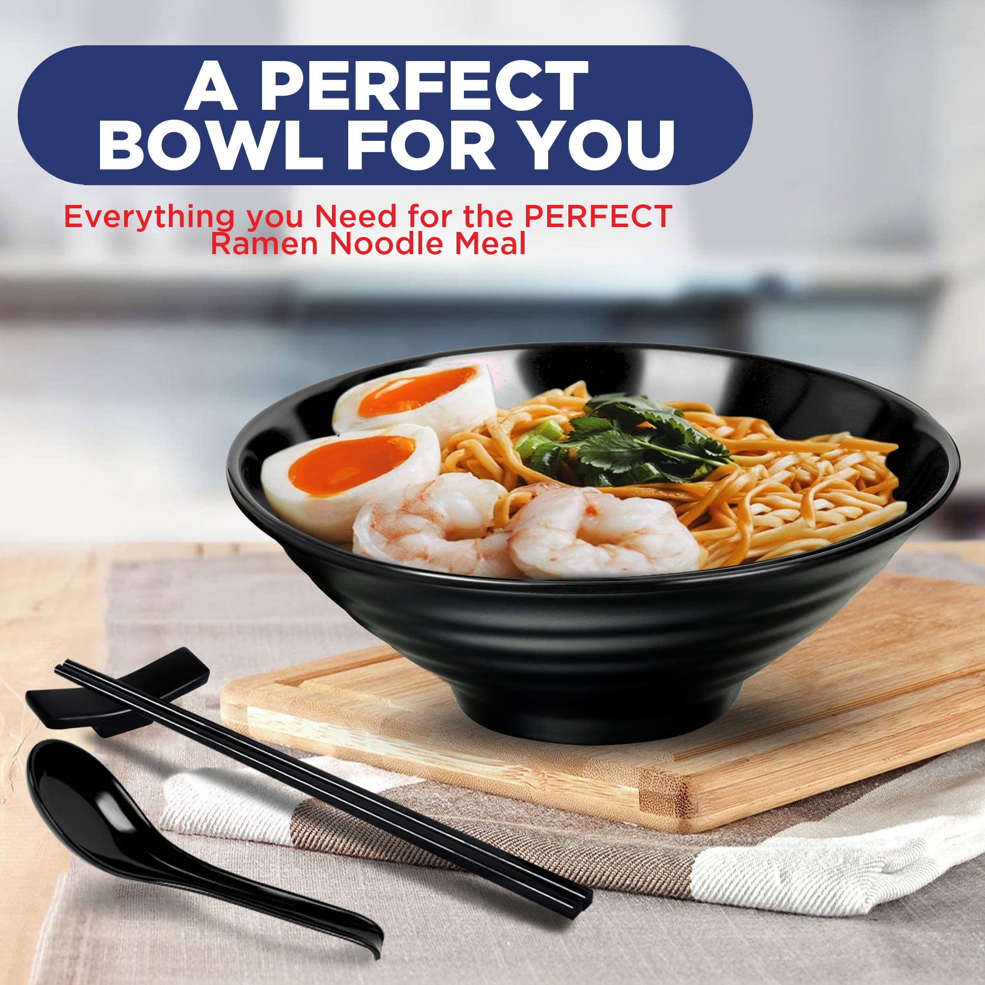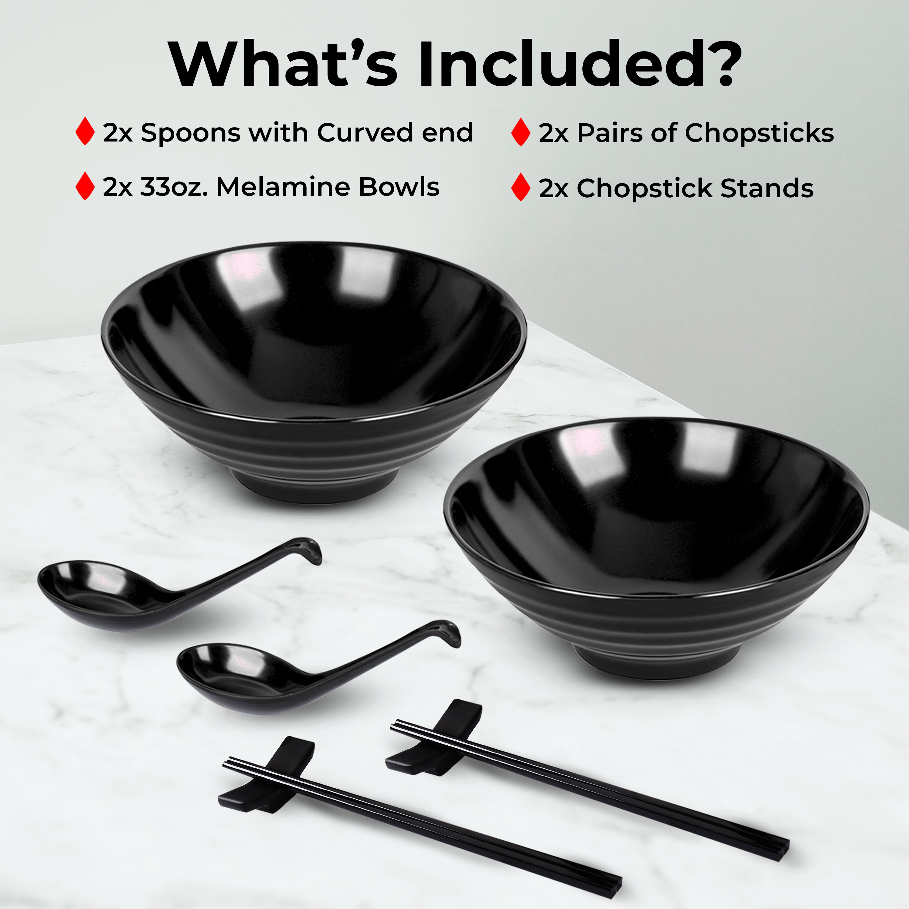Annie’s Kitchen Restaurant Quality 33oz Large Melamine Ramen Bowls and Spoons Set. 2 Complete Dinnerware Sets with Chopsticks and Stands. Black dinnerware set soup bowls are large bowls noodle bowl. Ramen noodles bowls, pho bowls, homemade Japanese Ramen, Korean Ramyeon, Thai, Miso, Udon, Pho Bowl. Large Soup Bowl set is light in weight, has a special base for carrying that keeps the heat off your hands too. Chopsticks rest nicely on the stands and not on the table. Spoons are curved on the end of the handle to prevent slipping into your bowl.