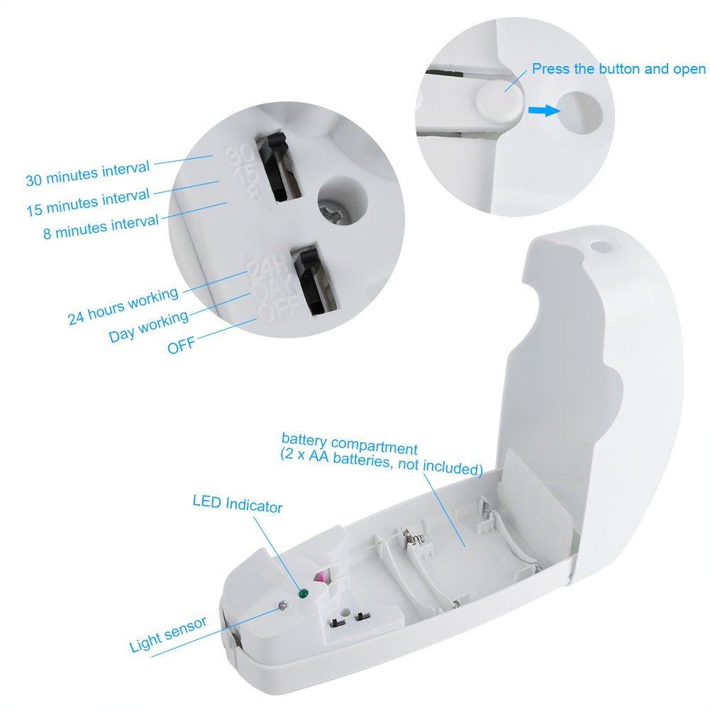 - With a light sensor, air freshener machine can identify daytime and night, 3 modes adjustable: 24 hours working/ day/off.