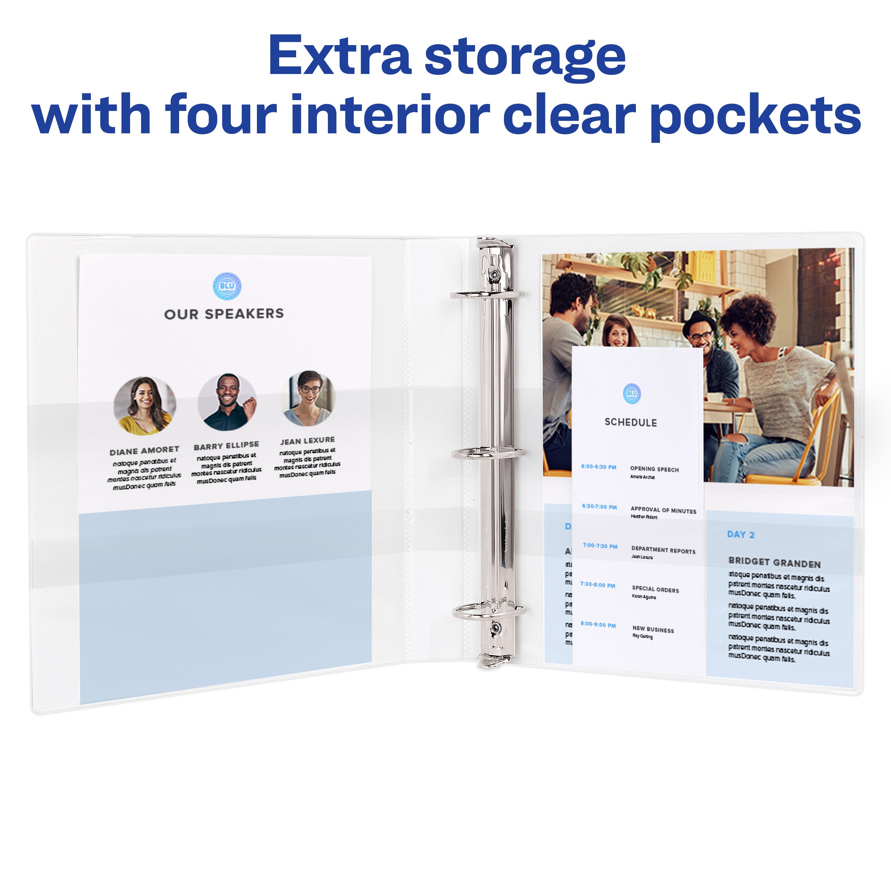 View Binder with EZD rings was designed with a purpose – to hold more pages in less space. EZD rings provide an increased capacity when compared to the same size slant or round rings. Tear-resistant DuraHinge design is stronger and lasts longer. DuraEdge feature makes the sides and top more pliable, providing greater split resistance. Deeply textured film offers a smoother finish and features a linen pattern for a high-quality look and feel. Durable construction is ideal for frequent referencing. Organize and secure papers within four interior pockets. Pages lie flat with back-mounted rings. Sturdy construction and clever design set a new standard in binder performance. Customize your binder with free templates and designs at Avery Design and Print Online.