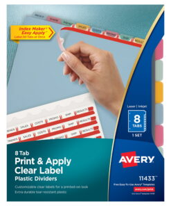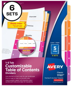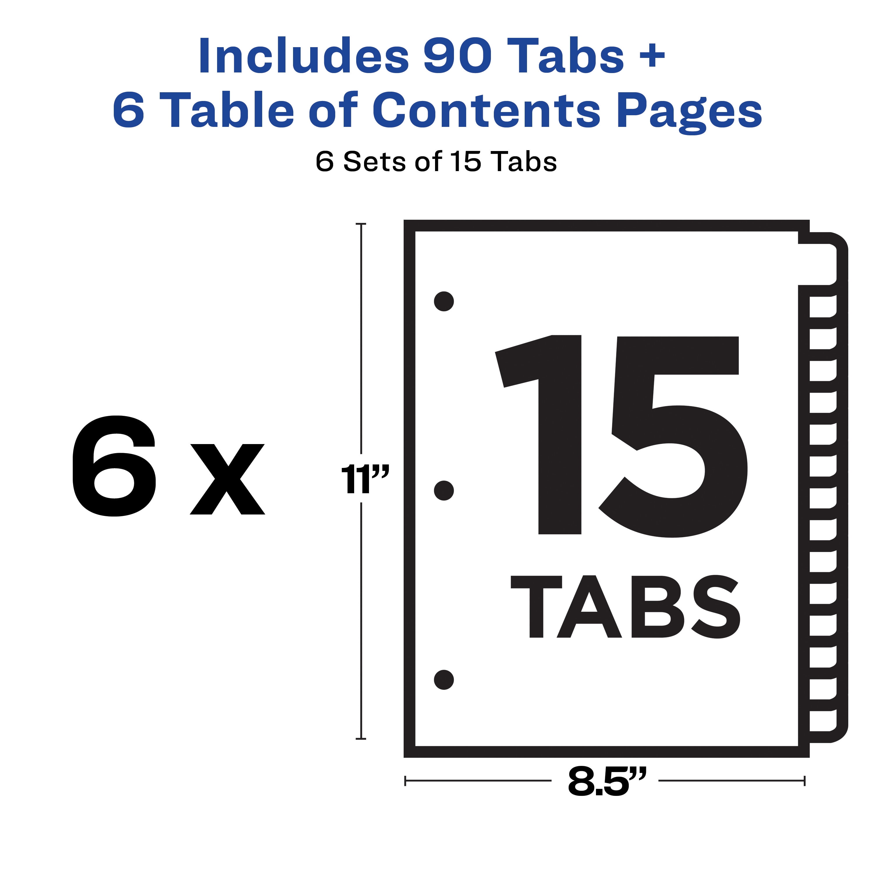 Organize your projects in moments with Avery Ready Index 15-tab dividers. Each tab is preprinted and uniquely color coded for a professional appearance. Print your own custom section titles and images onto the table of contents sheet without worrying about labels or inserts. Whether you’re creating planners for classes or hosting a presentation, these dividers are ideal for getting everything sorted. 6 sets of 15 tabbed dividers are included with each sheet measuring 8-1/2"x11". The 3 binder holes are reinforced on both sides of the heavyweight sheet to prevent creasing and tearing. Each divider tab includes additional reinforcement along the edge of each page to distribute stress and resist folding. The printable table of contents is dual compatible with both laser and inkjet printers. This sheet can also be printed in either portrait or landscape so that your projects can be displayed in any orientation. Just flip the sheet to view the other layout on the opposite side. Try out free templates for these dividers and check out the Avery Design & Print software at avery.com/templates.