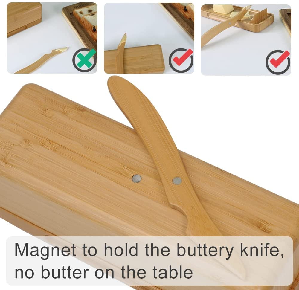 - CONVENIENT MAGNET: More than just a pretty dish, a magnet built into the lid keeps the included bamboo butter knife with the lid so you can carry everything in one hand without a knife sliding to the floor; Easily rest the knife on the magnet during use; no more hunting for a knife with this magnetic butter dish.