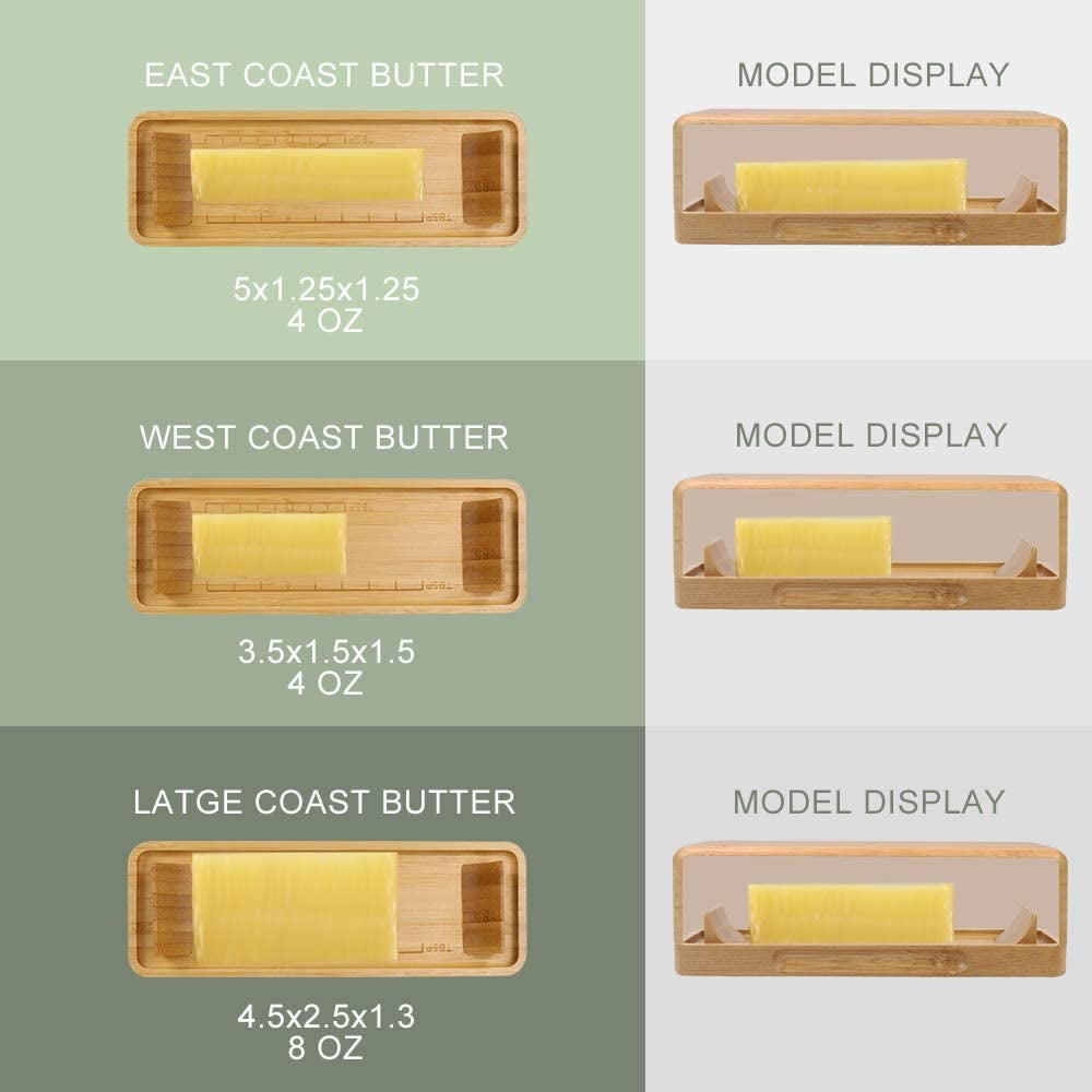 - STOP WORRYING BUTTER HITTING THE LID: The optimum size L: 8.7" x W: 3.1" x H: 3".It is an ideal butter keeper for most of butter brand. Be it long and slim west coast sticks, short southeast coast or European butter blocks.