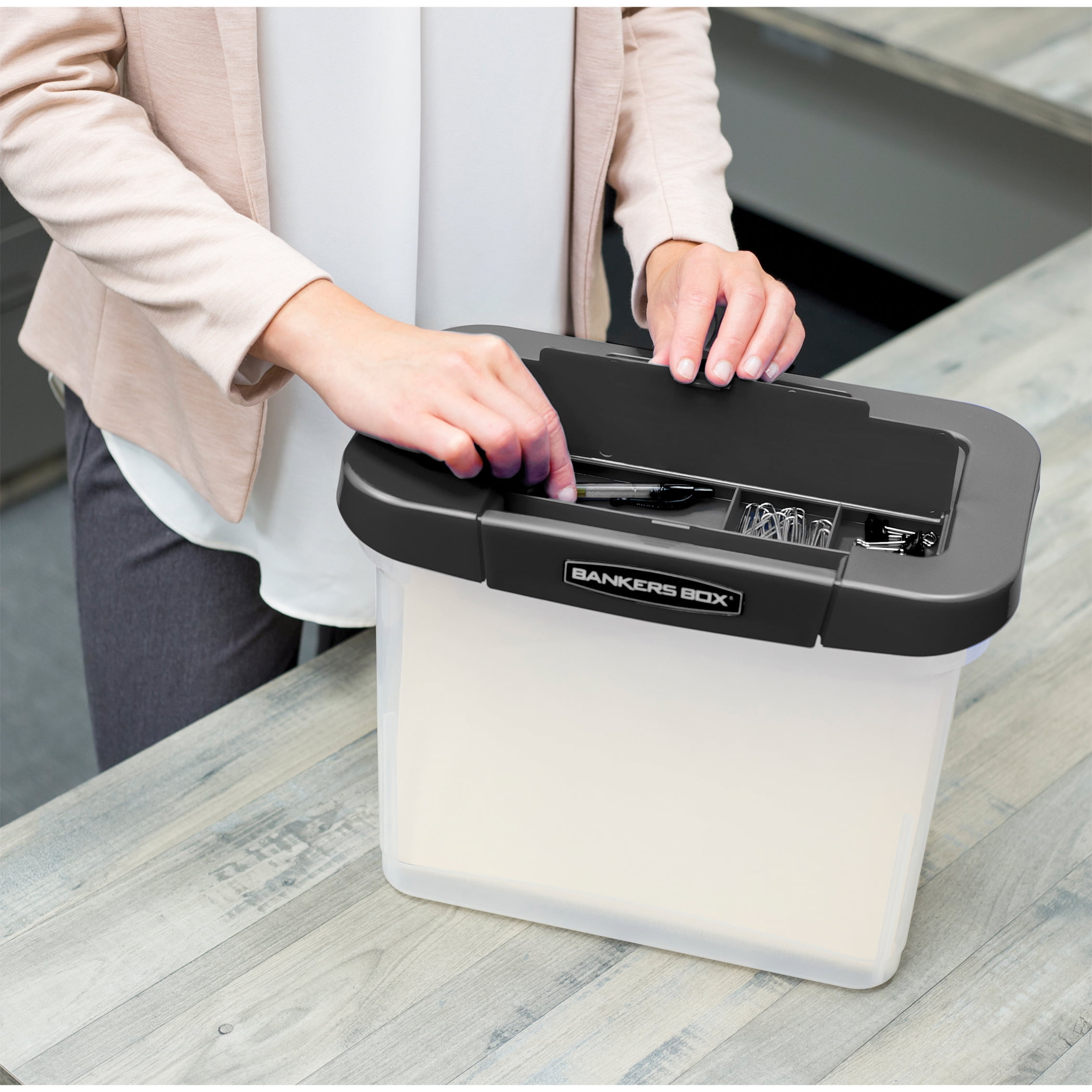 - Plastic storage boxes with lids provide organized and secure storage and transport of letter/legal size files