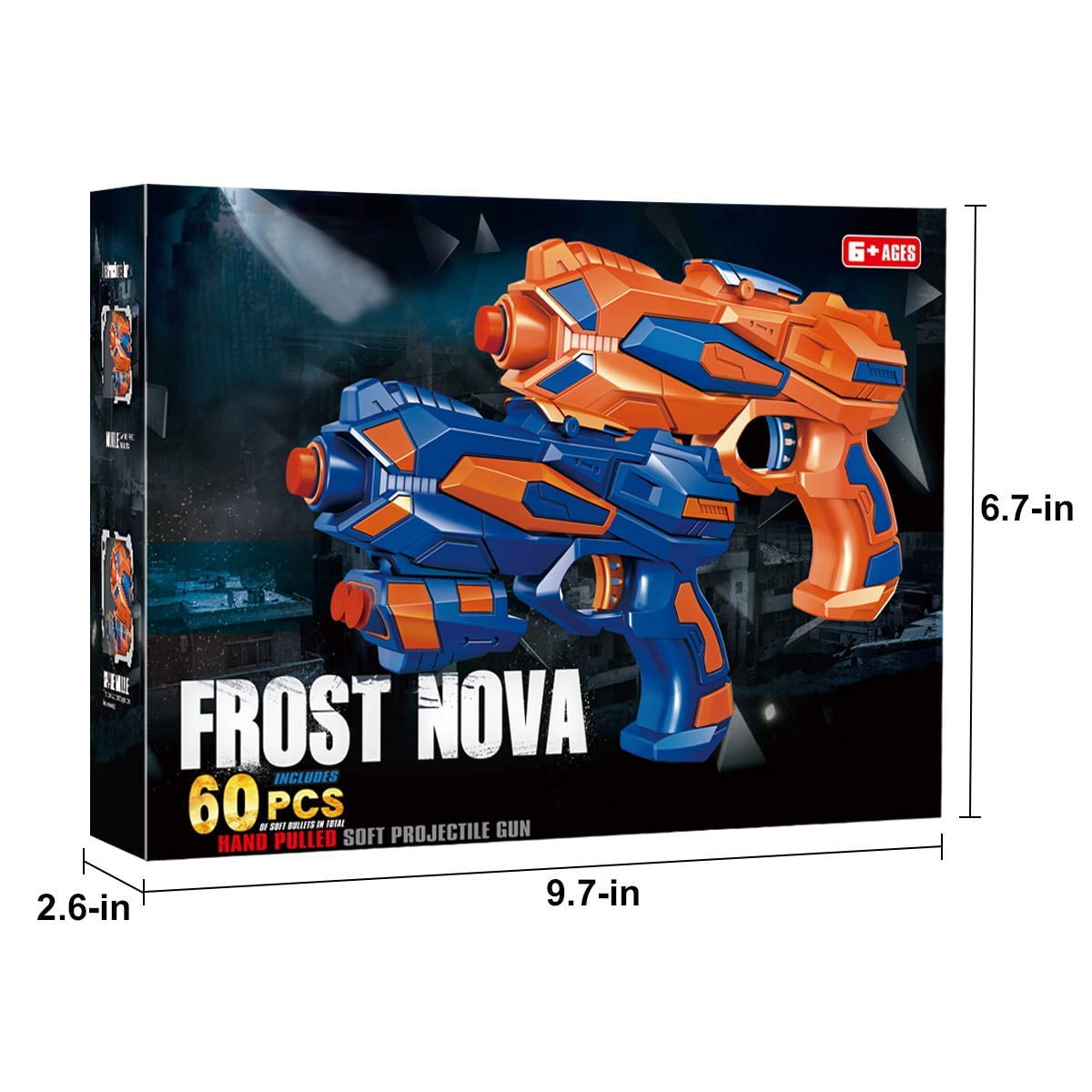 - Package Includes: 2 blaster guns (orange and blue) with 60 pcs soft foam bullet darts. Blaster Guns Dimension:8.3*5.5 inch, suitable for children over 3 years old, Adults also can play.