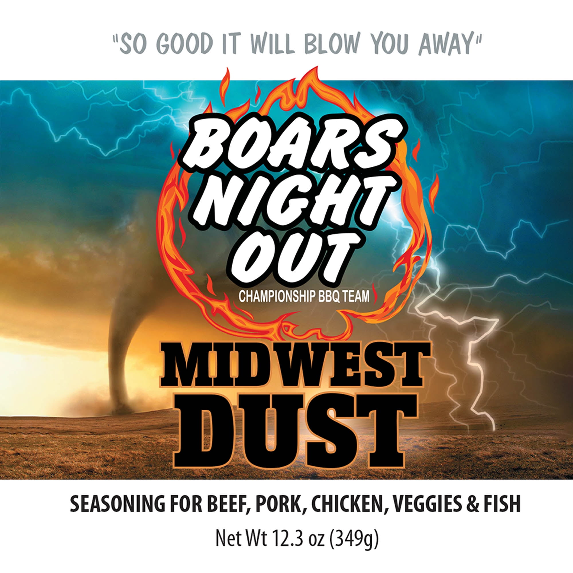 Boar’s Night Out Midwest DustBoar’s Night Out Midwest Dust is so good it will blow you away. The weather report is in and Midwest Dust is sweeping across the country. Midwest dust goes great on anything and because of that it’s racking up more competition awards than we can count! Features and Specifications• Winner of Many BBQ Championships• Great on Beef, Pork, Chicken, Veggies and Fish• 12.3 oz. Bottle• Allergen Free• Gluten Free