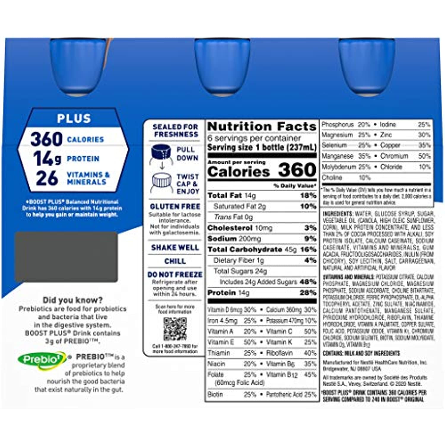 BOOST Plus Drink—now with a new great taste—provides 360 nutrient-rich calories and 14 g of high-quality protein in each 8 fl oz bottle. The increased calorie and protein intake may help you achieve and maintain a healthy weight. It also provides 3 g of fiber and 26 vitamins and minerals, including calcium and vitamin D to maintain strong bones. Gluten free & no artificial colors or sweeteners.