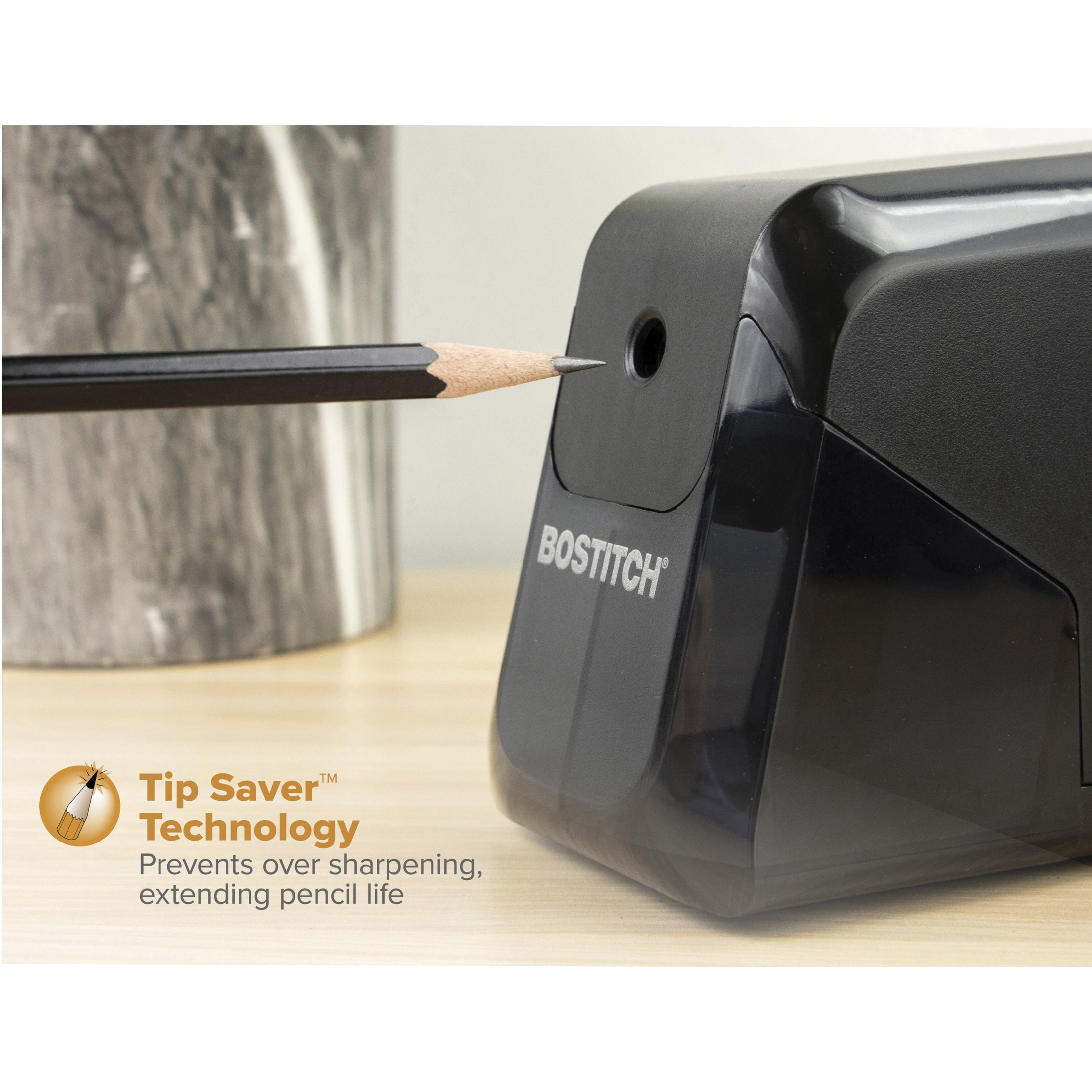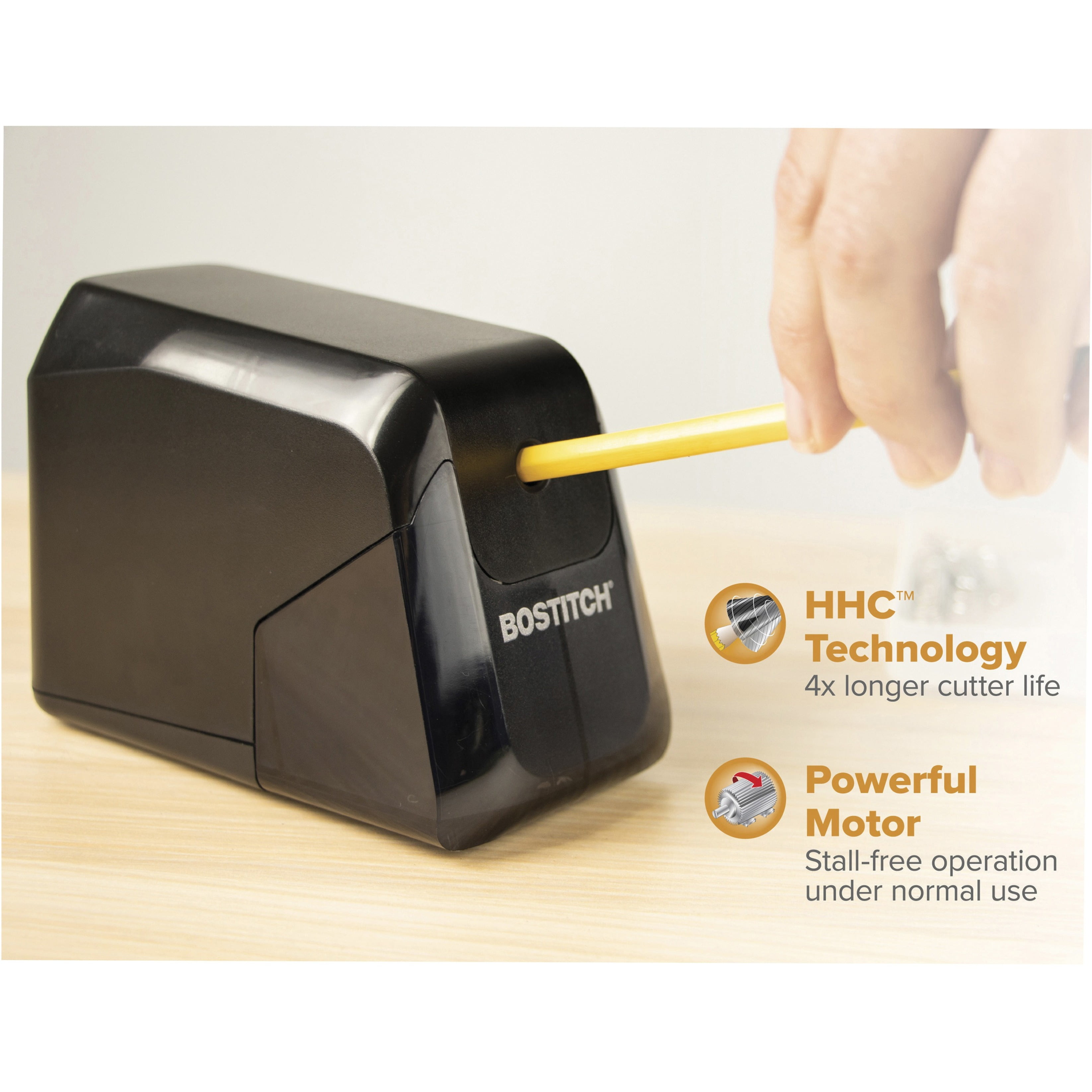 Calling all artists, office workers and teachers! Your new favorite office supply has joined the league of elite sharpeners here at Bostitch Office. The Battery Powered Pencil Sharpener is perfect for any personal use, home office or cubicle. Featuring a sleek, black exterior and large capacity shavings tray, this battery powered pencil sharpener is the perfect pairing to any pencil in need of sharpening! With built-in HHC™️ cutter technology, this sharpener has the added benefit of extending your cutter life by 4x. The Tip Saver Technology produces a perfect pencil tip each time while avoiding the constant problem of over sharpening pencils, resulting in longer life pencils. This sharpener is also compatible with all colored pencils so you can unleash your inner artists with no colored pencil jams here!