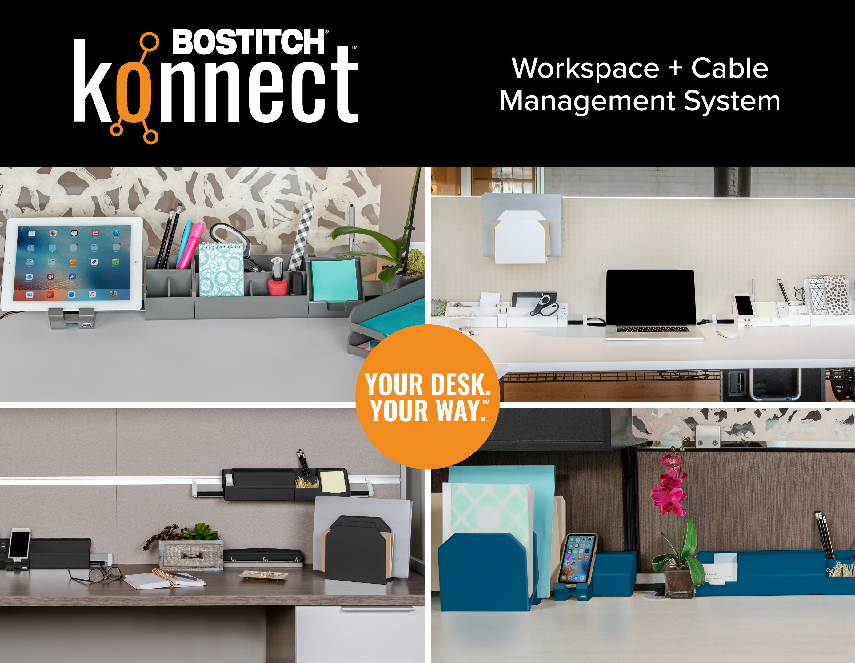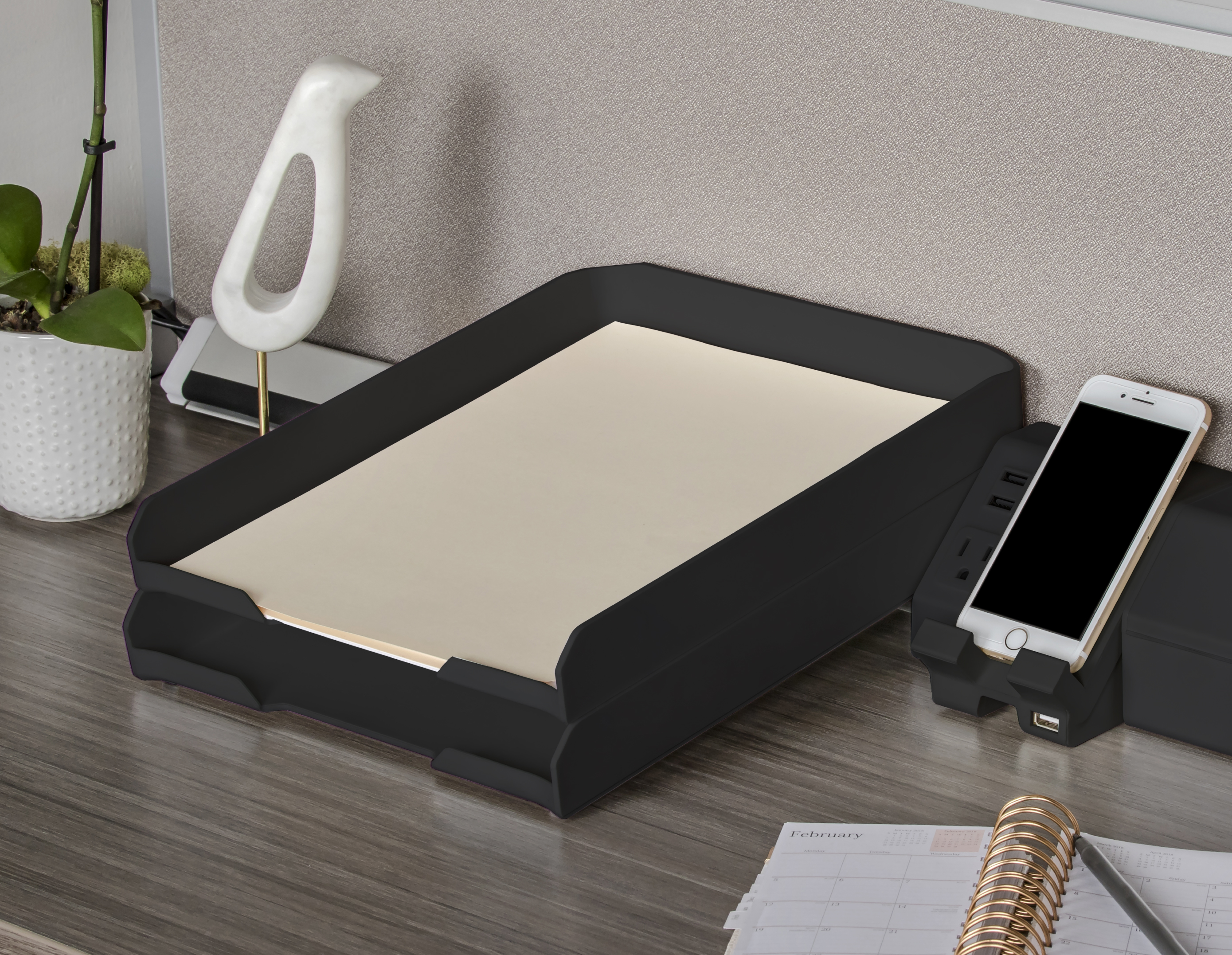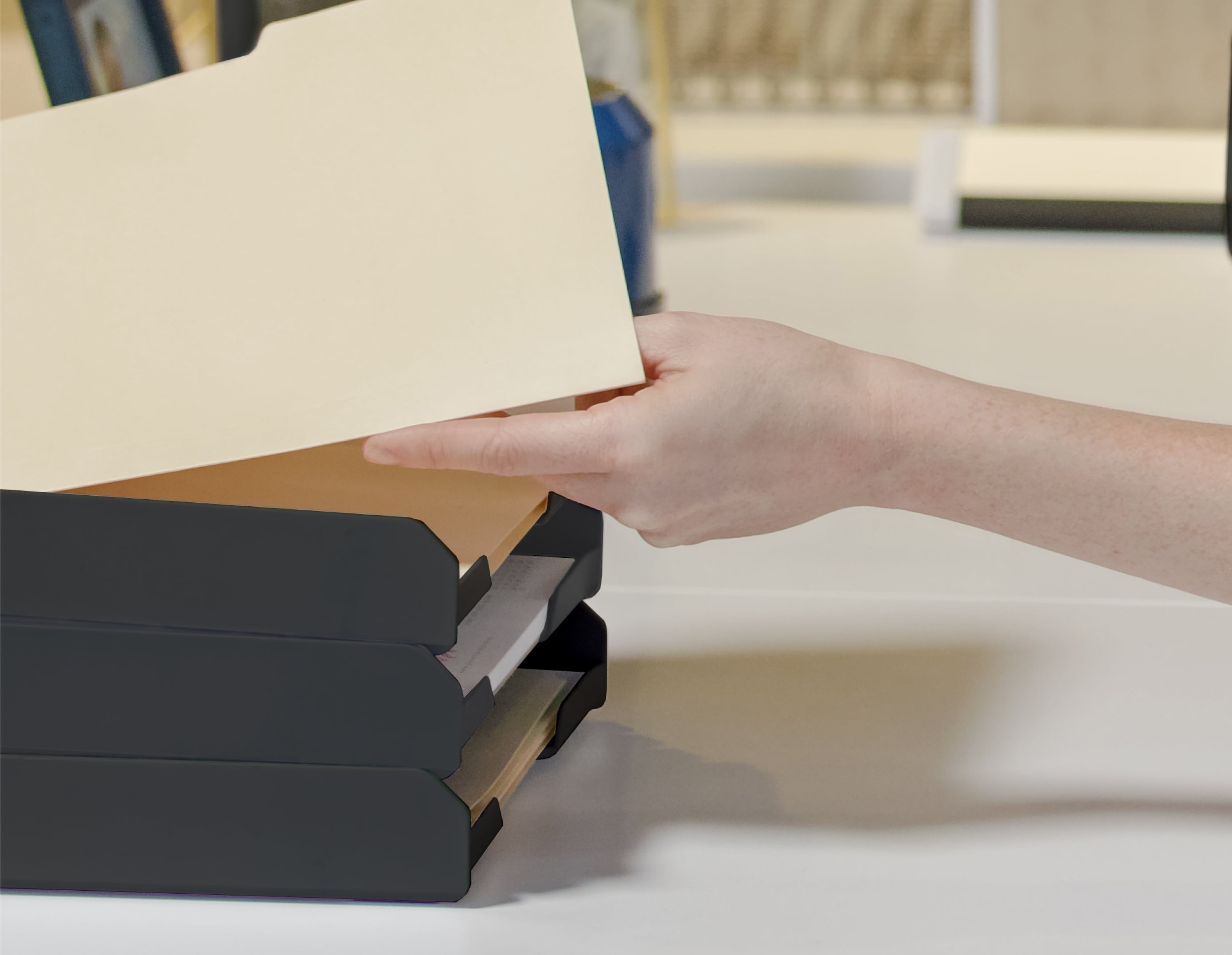 Storage tray features a deep capacity design with a wide opening to hold more while providing easy access to your documents. Stackable construction lets you add more trays directly on top for space-saving desktop organization. Tray can be docked to the Konnect cord management rail (sold separately) or used alone. Storage tray is designed to hold papers and folders up to 9-3/4" x 12".