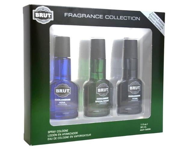 This gift set includes Brut Blue, Brut Special Reserve, and Brut Black. All are 1 oz Cologne Sprays.Faberge Co. Brut Fragrance Collection Gift Set for Men, 3 pc: