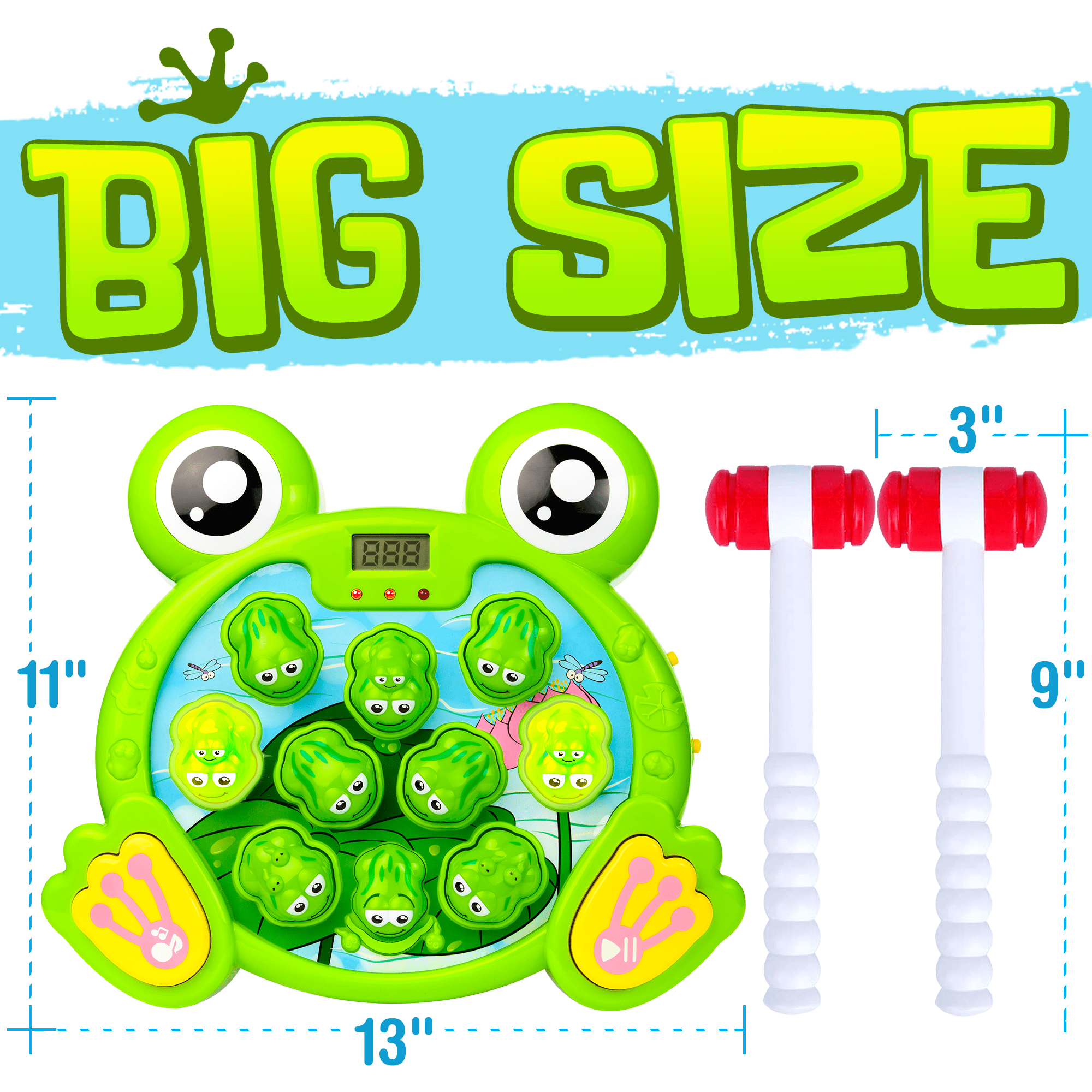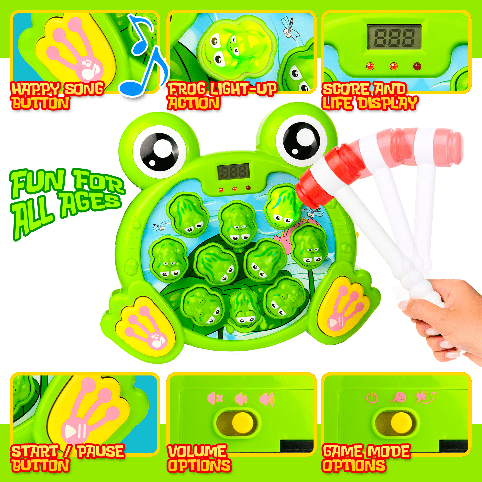 - MUSIC and LIGHT BUTTON: This whack a frog game has real frog sounds and fun music for kids to enjoy, while the eyes and the cute little frogs light up when the music button is tapped.