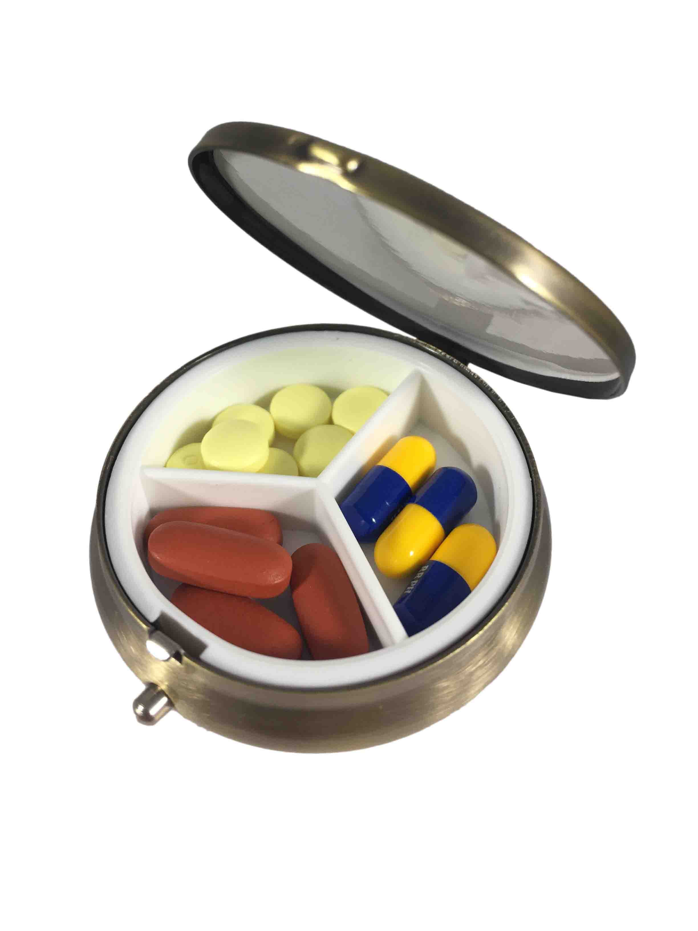 Round Pill Box With Beautiful Brass Finish Three Sections for Keeping Pills Separate Lightweight, Discreet Way to Carry the Medication You Need Perfect for Size for Your Pocket, Purse, or as a Travel Case Small and Compact-2 Inch Diameter