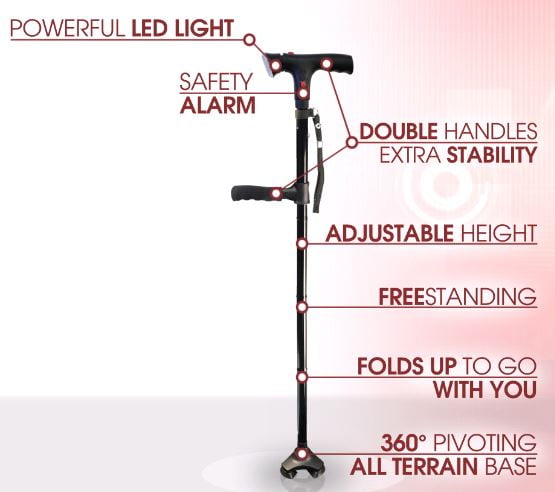 The Clever Cane has double handles for extra stability, adjustable height, an all-terrain 360-degree pivoting base, a powerful built-in LED light, a safety alarm, it is freestanding plus it folds up to go with you.Clever Cane