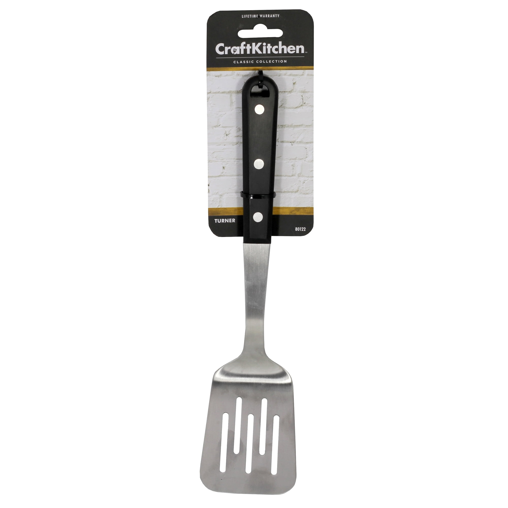 The Craft Kitchen Stainless Steel Turner is ideal for lifting and turning all your favorite foods. The slotted head helps drain excess liquids when cooking with oil. The durable triple rivet handle and stainless steel head won’t bend, warp or break. Dishwasher safe for easy clean-up. Lifetime Warranty.