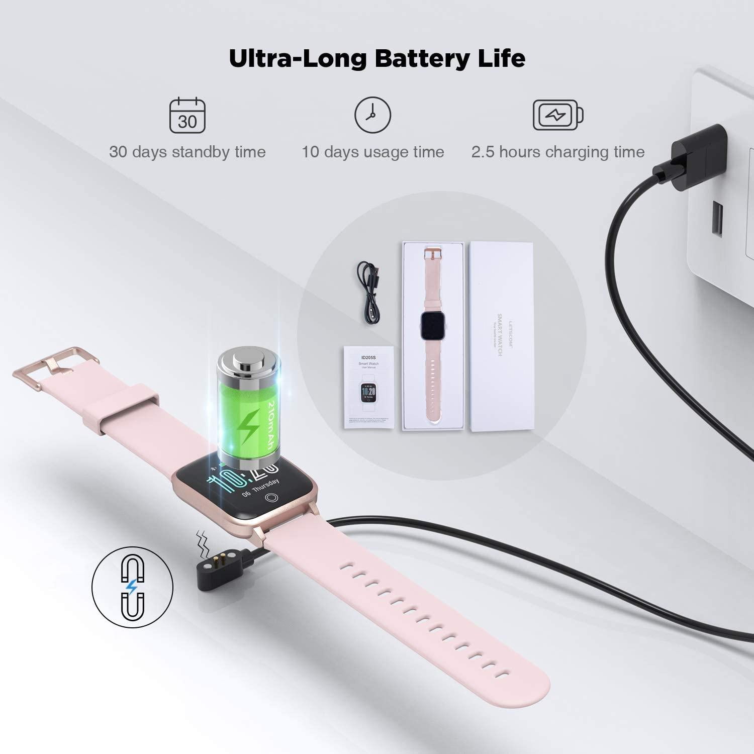 Features: Activity Trackers & 11 Sports Modes. This smartwatch has 11 sports modes. It is able to provide complete and accurate tracking of your activities, including heart rate, step count, distance, speed, calories burned, etc, and progress towards your fitness goals. 24/7 Heart Rate Monitor & Sleep Tracker Automatically monitor your real-time heart rate, and provide a comprehensive analysis of your sleep quality (deep sleep, light sleep, and wake-up time) to help you develop a healthier lifestyle. Call & message notifications Receive and read SMS messages and SNS notifications straight to your device, including Facebook, Twitter, WhatsApp, LinkedIn, and Instagram, etc. You can also hang up incoming phone calls straight on the watch. Waterproof Fitness Watch & Long-Lasting Battery Smart Watches are designed with IP68 waterproof, you can wear them when washing hands, running in the rain, and swimming. Large battery capacity and low power consumption will offer longer battery life. It supports 7 days of normal use and 30 days standby time. Smart Watch compatibility Download and install the Free "Variator" APP, it is compatible with most above iOS 9.0 & Android 4.4 smartphones. Relaxation Training and Timer Settings Relax with a built-in breathing guide program on our fitness watch that allows you to relieve stress, and use timer settings to measure your workouts, or even for other everyday activities like cooking. Specifications: Model: ID205S. Bluetooth transmission distance: 10 Meters (33 feet). Screen size: 1.3 inches. Screen type: TFT LCD color screen. Material: Upper. Casing: PC+ABS; Strap: TPU Suits for the wrist. Size: 5.4 inch – 8.6 inch. Battery type: Li-Battery. Battery capacity: 210 mAh. Working time: ≥10 days. Charging time: ≤2.5 hours. Weight: 1.09 oz (31g). Long Battery Lift: 30 Days Standby, 7 Days usage time Compatibility: Requires iOS 9.0 or later / Android 4.4 or later system, Bluetooth 4.0 or later (Smartphone only, not compatible with iPad, PC, or tablets). 11 Sports Modes: Outdoor Run, Outdoor Walk, Outdoor Cycling, Indoor Walk, Elliptical Trainer, Indoor Cycling, Indoor Run, Hiking, Other, Rower, Yoga Package included: 1 * ID205S Smart Watch, 1 * Magnetic Charging Cable, 1 * User Manual.