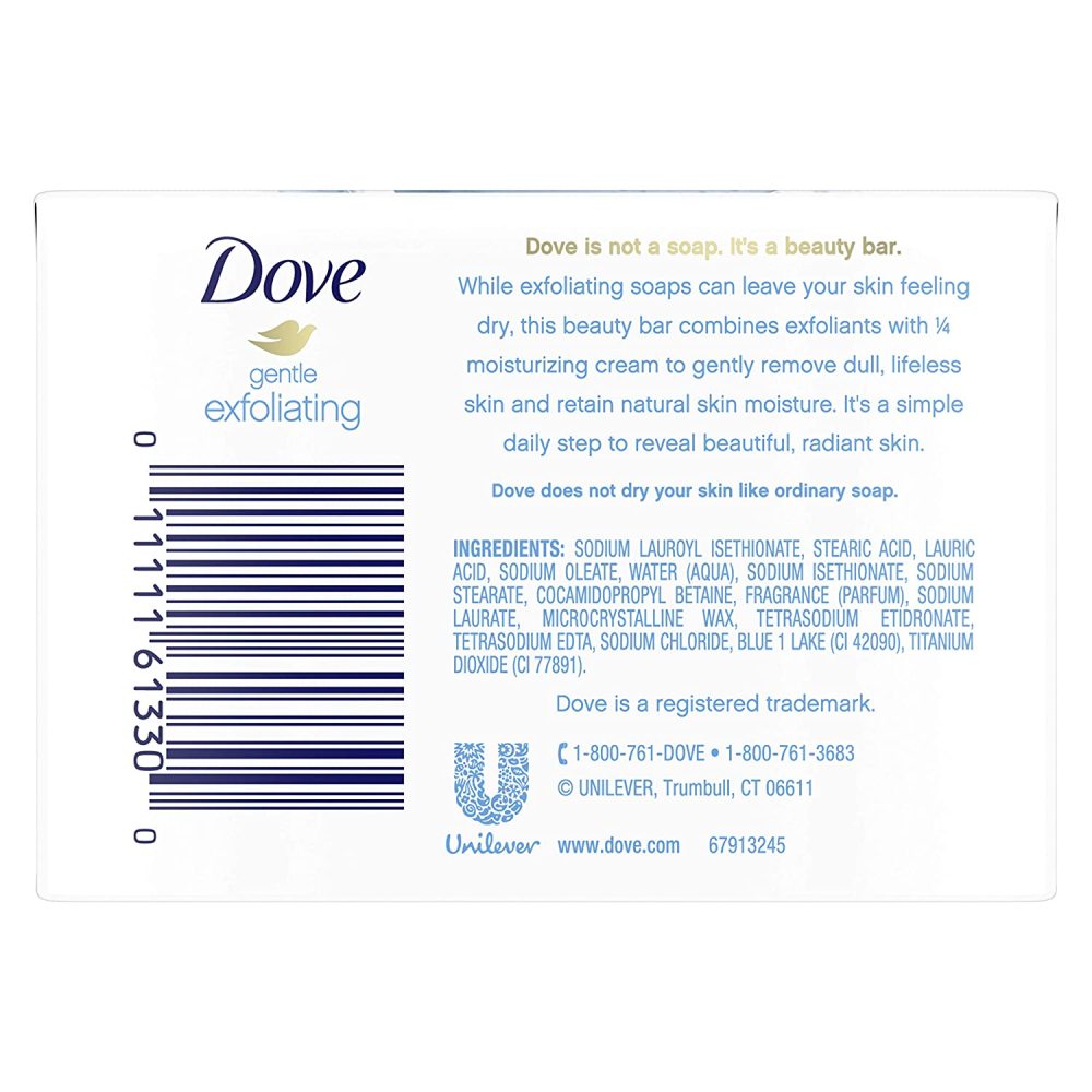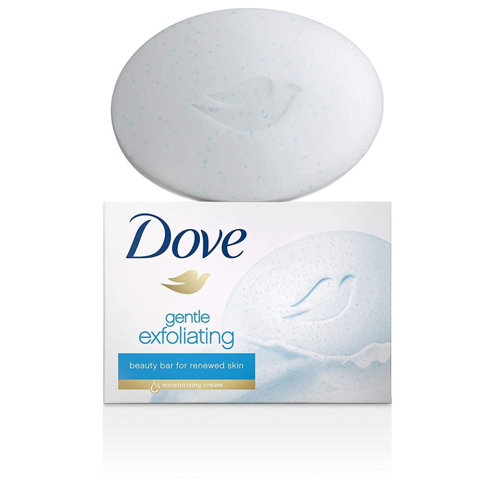 - Dove Gentle Exfoliating Beauty Bar contains exfoliating beads that gently wash away dead skin