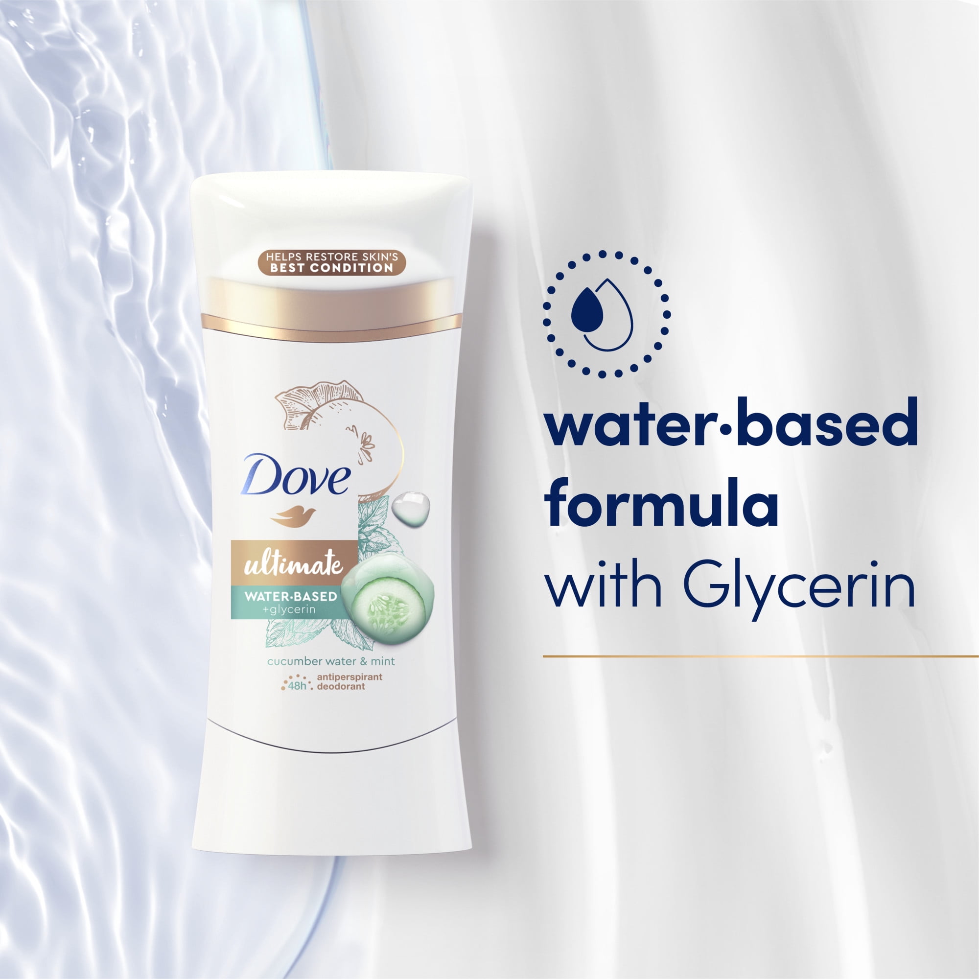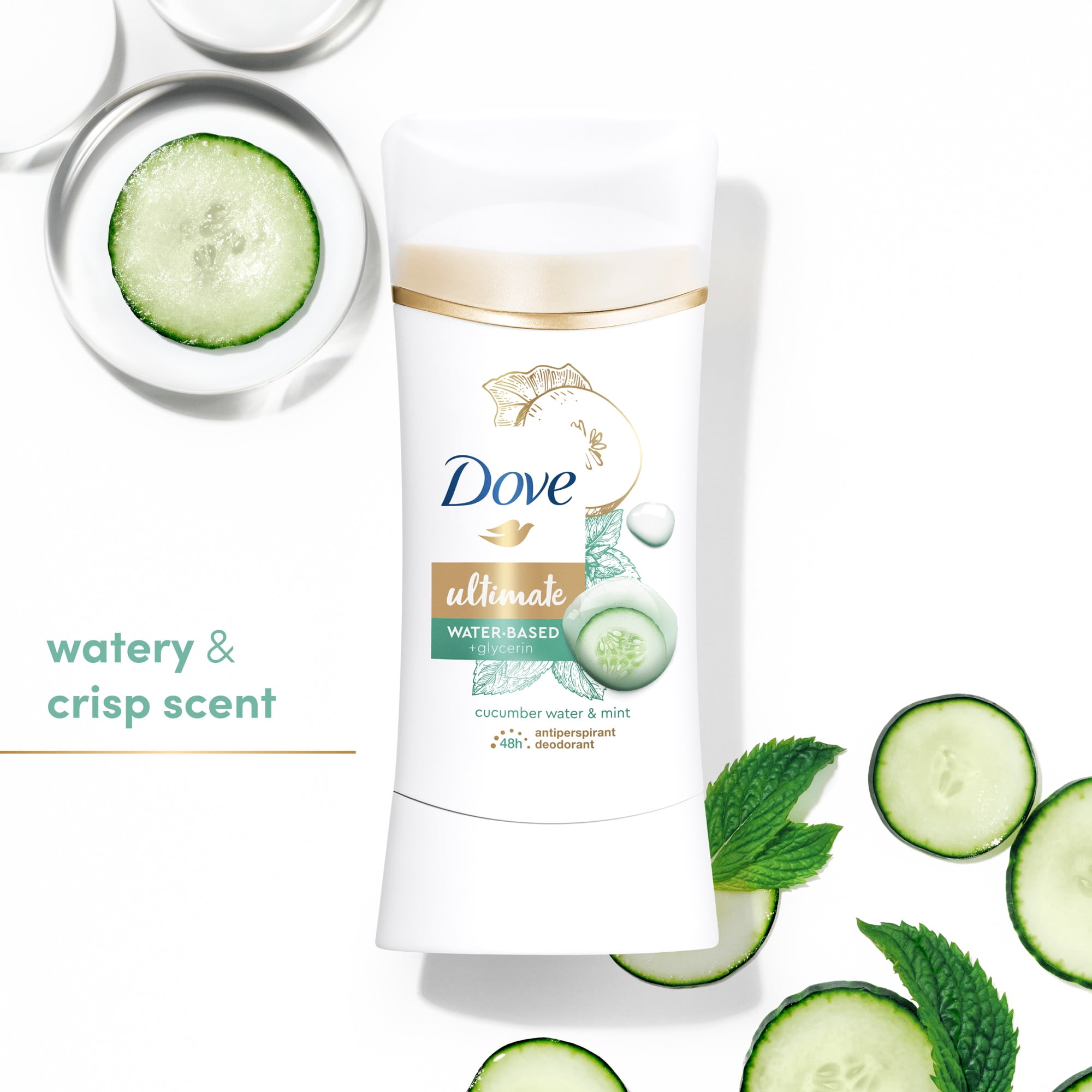 Dove Ultimate Antiperspirant Deodorant Stick Cucumber Water & Mint combines Dove’s most caring formula with a refreshing scent, giving you 48-hour antiperspirant protection while helping to soothe your delicate underarm skin. The water-based, moisturizing formula of this antiperspirant stick gives you the ultimate in underarm care to help restore skin to its best condition, leaving you with soft, even skin. Dove Ultimate uses a breakthrough water-based formula, which works in harmony with powerful skin care actives like glycerin, and strengthens your skin barrier for more resilient skin. Reduce underarm wetness and keep sweat and odor at bay with the 48-hour antiperspirant protection of this essential stick. Dove Ultimate has a unique water-based formula that creates an even fresher fragrance experience. Created with gentle ingredients, the cucumber water and mint scent of this antiperspirant deodorant for women will keep you feeling fresh. To get the best results from your Dove Antiperspirant Deodorant Stick, apply it to clean, dry underarms, gliding it gently across your skin for long-lasting coverage. With such a gorgeous scent, if you forget your perfume, youll still smell fabulously fresh. Just let the cucumber and mint do the talking. This antiperspirant deodorant is certified by PETA. Globally, Dove does not test on animals and is certified cruelty-free by PETA. *vs Dove Advanced Care