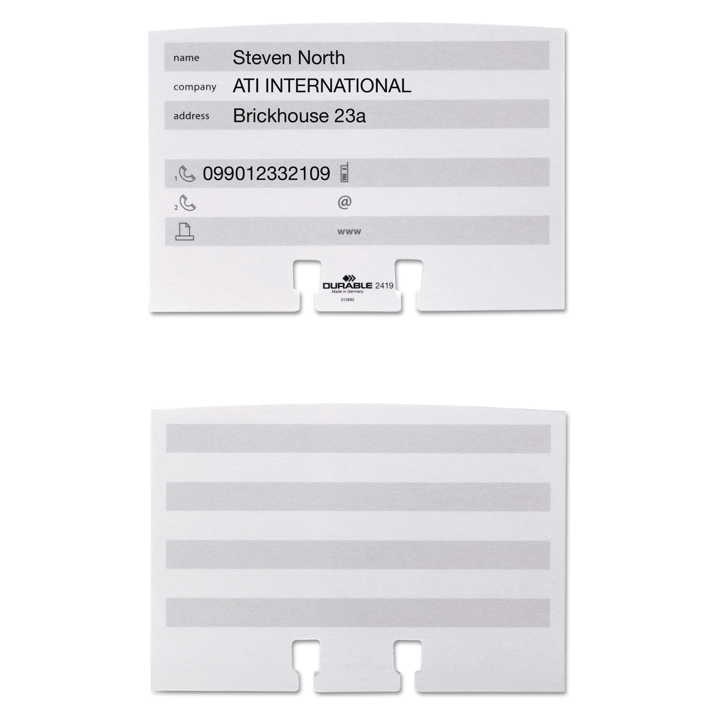 Keep your contacts organized with the DBL241201 Durable TELINDEX Desk Address Card File. It gives you a nice blend of sleek design and user-friendly features. This desk card holder provides the optimum viewing angle and easy access to the contents. It’s constructed from strong plastic for long-lasting use. This address card holder includes 500 cards that are 4-1/8" x 2-7/8", double-sided and slotted with entry fields and 25 alphabetical (A-Z) dividers. It also accommodates VISIFIX sleeves, sold separately. Rubber pads on the bottom prevent slipping.