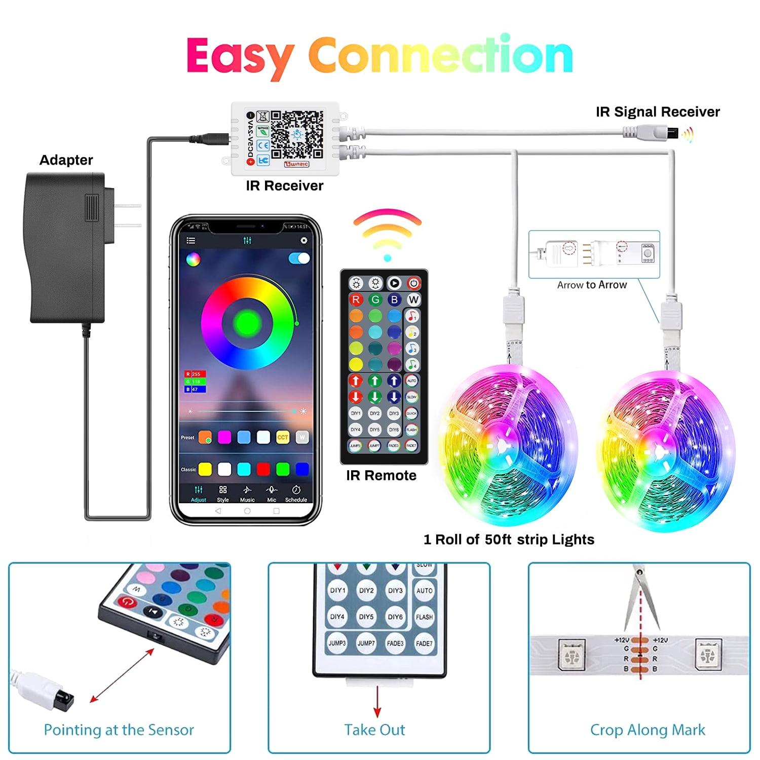 - [ Smart App & IR remote control ] LED strip lights supports both App control on your phone and 44 keys IR remote control, which allow you change the color and the mode of the led strip lights wirelessly and conveniently for your bedroom, living room, home decor, etc.