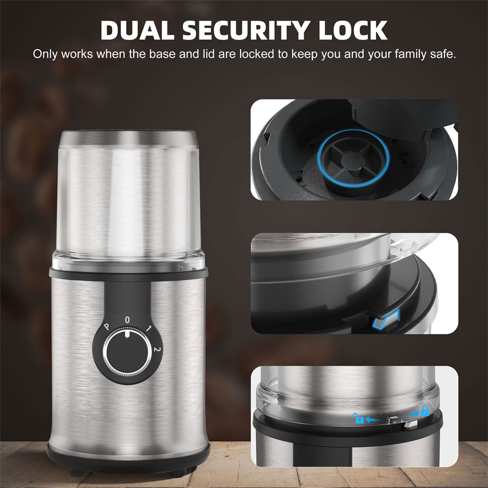 【Continue Your Morning Routine While Grinding】Elemore Home electric coffee grinder offers 2 automatic speeds: "1" for slow speed, "2" for fast speed. They allow you to free your hands for other things while grinding, especially when you’re in a hurry. No complicated procedures, very easy to use. Lock the lid after pouring, turn on the switch, you can easily monitor the consistency of the grinds through the transparent lid.