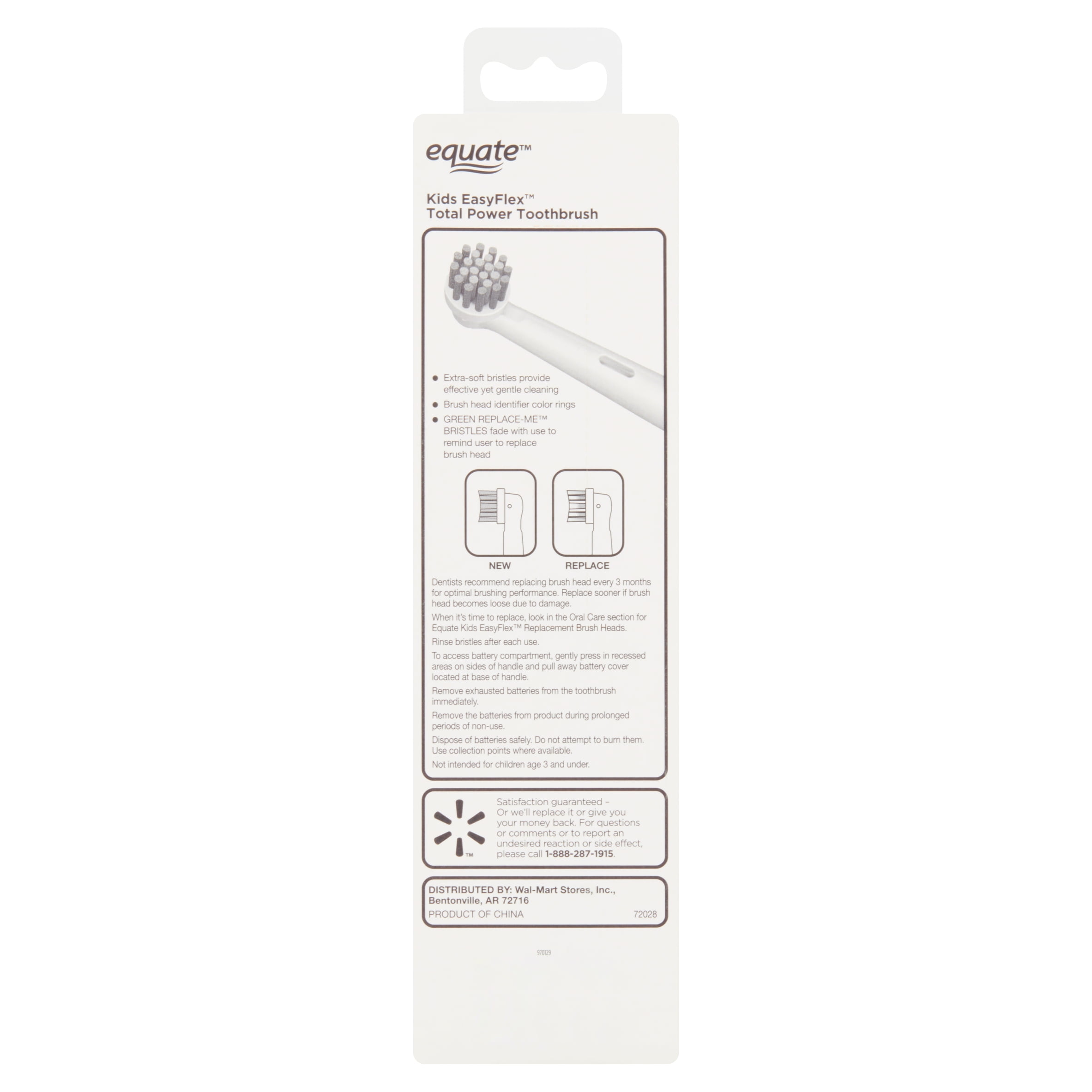 Make brushing fun with Equate Kids EasyFlex TotalPower Tooth-brush. This battery powered toothbrush is designed specifically for youngsters and comes in fun color handles that are easy to operate with small hands. Most importantly, this kids toothbrush penetrates deep into hard to reach areas for a more effective and comprehensive clean compared to manual toothbrushes. Includes 2 AA batteries. For optimum hygiene, replace your toothbrush head every 3 months.