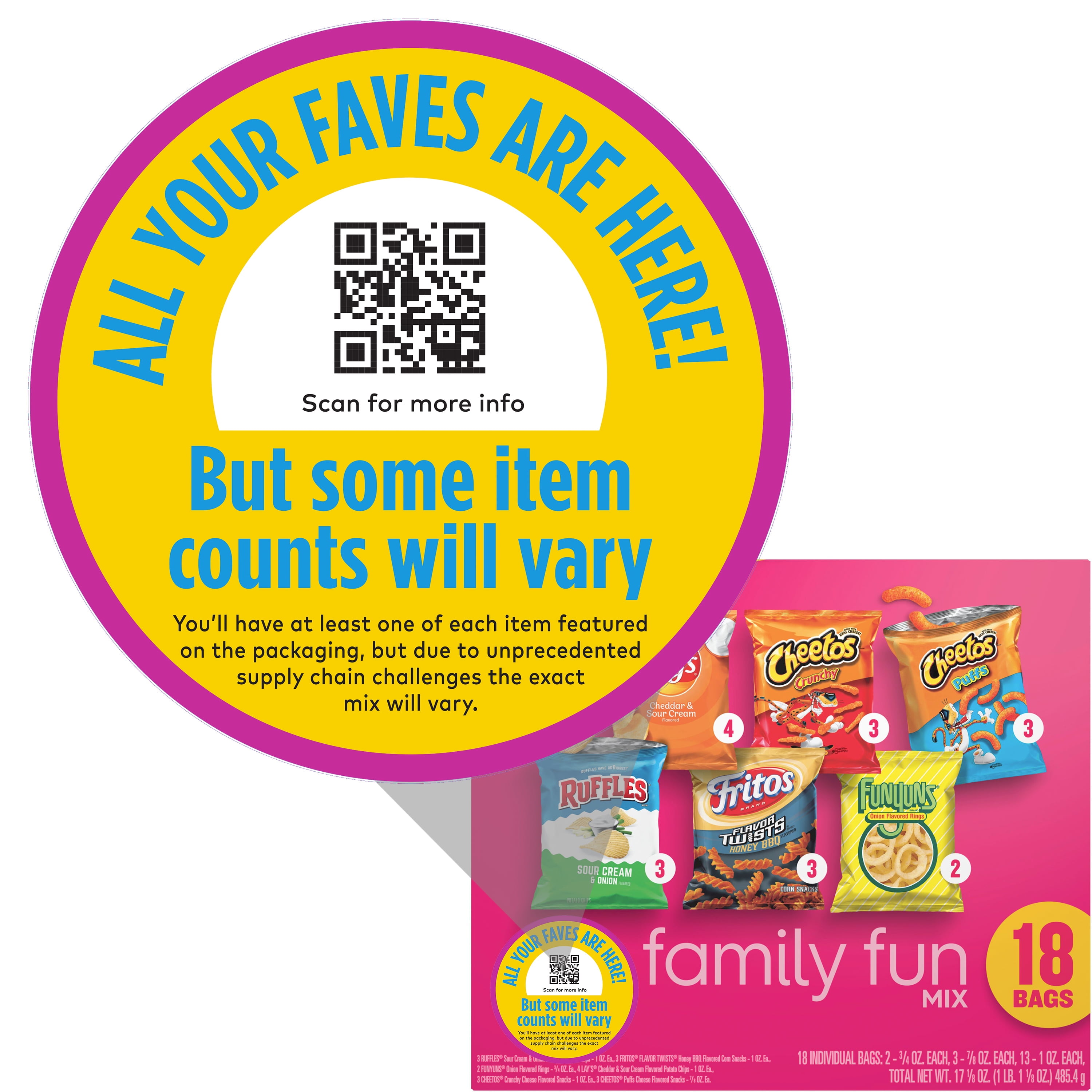 - 18 Count Family Fun Variety Pack Includes: Lay’s Cheddar & Sour Cream, Cheetos Crunchy Snacks, Cheetos Puffs, Ruffles Sour Cream & Onion, Fritos Flavor Twists Honey BBQ, and Funyuns Onion Flavored Rings