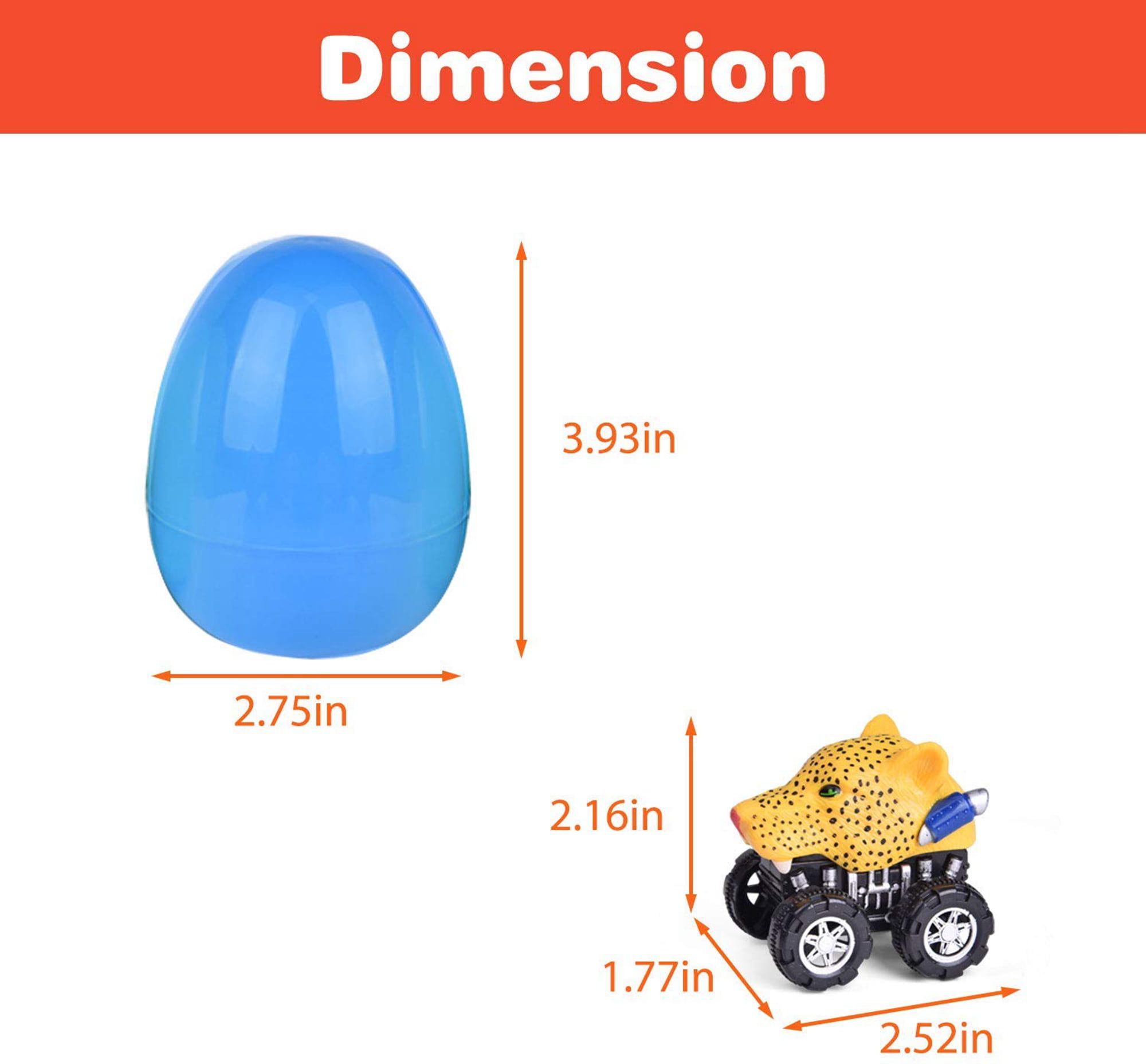 Speedy animal pullback cars and whiz off into hours of racing fun! Unique safari pullback race cars tucked inside the colorful plastic Easter eggs; no animal vehicle is duplicated. Wild animal car models including a tiger, leopard, wolf, dinosaur, rhinoceros, alligator, eagle, shark, panda and more. Thanks to the high-grad quality, our push and go pull back monster vehicles can withstand childrenâs rough play and even bump on the wall. Pullâem back and watchâem go! Race these animal toys into goody sacks. These mini safari pullback cars make great party favors on Easter or tokens to hand out on your next trip to the zoo.