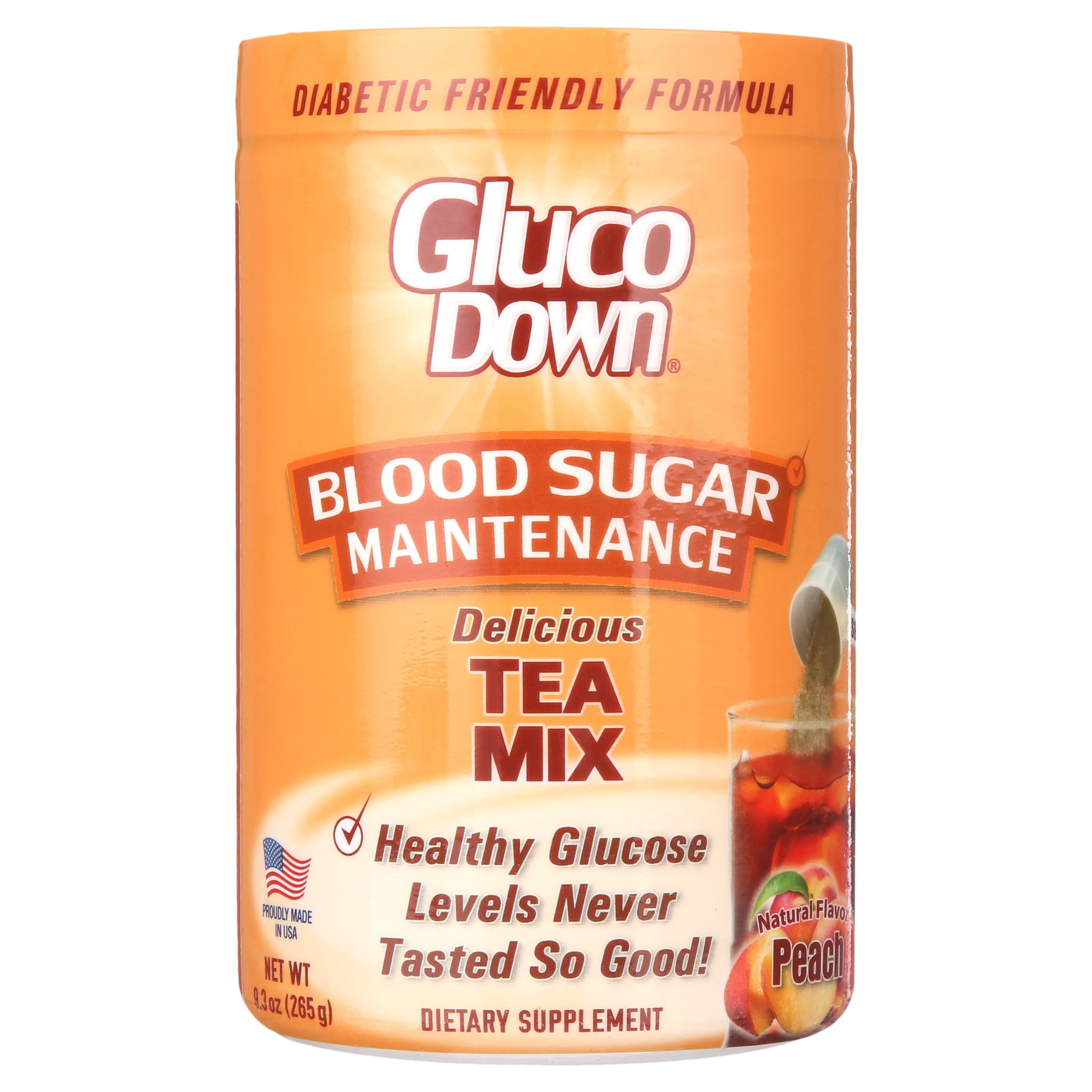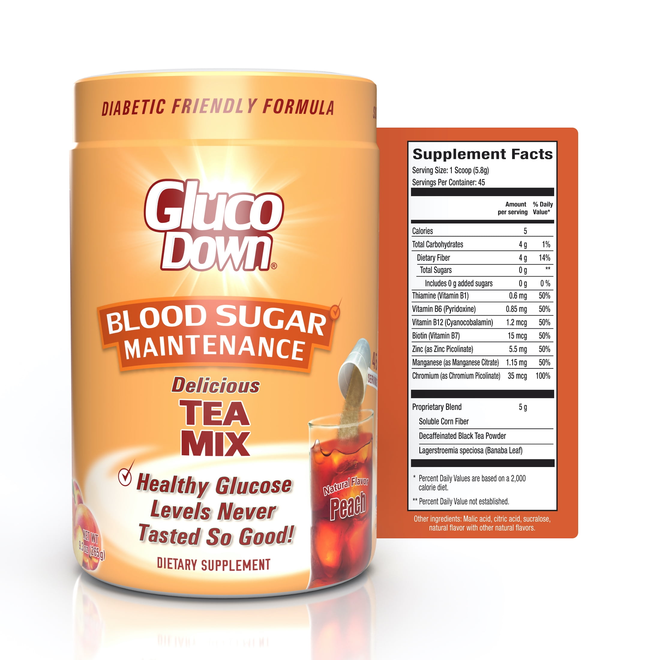 GLUCODOWN® Peach Diabetic Friendly Tea Mix is enriched with vitamins & minerals, the natural plant extract Banaba Leaf plus a unique soluble fiber clinical data indicates helps moderate rising blood sugar levels after-meals and helps maintain regular digestive health. Sugar-free, Dairy-free, Gluten free, Decaffeinated & Delicious. GlucoDown® "Healthy Glucose Levels Never Tasted So Good!"