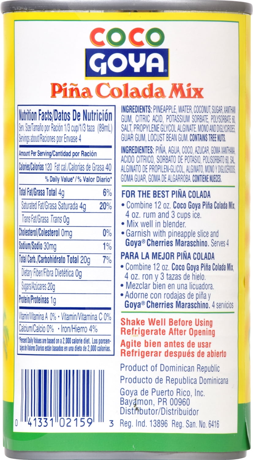 GOYA Coco Pina Colada Mix 12 Oz. Product of Dominican Republic. For the Best Pina Colada: Combine 12 oz Coco Goya Pina Colada Mix, 4 oz rum and 3 cups ice. Mix well in blender. Garnish with pineapple slice and Goya Cherries Maraschino. Serves 4. Shake well before using. Refrigerate after opening. Contains tree nuts. 12 fl oz (355 ml) Bayamon, PR 00960