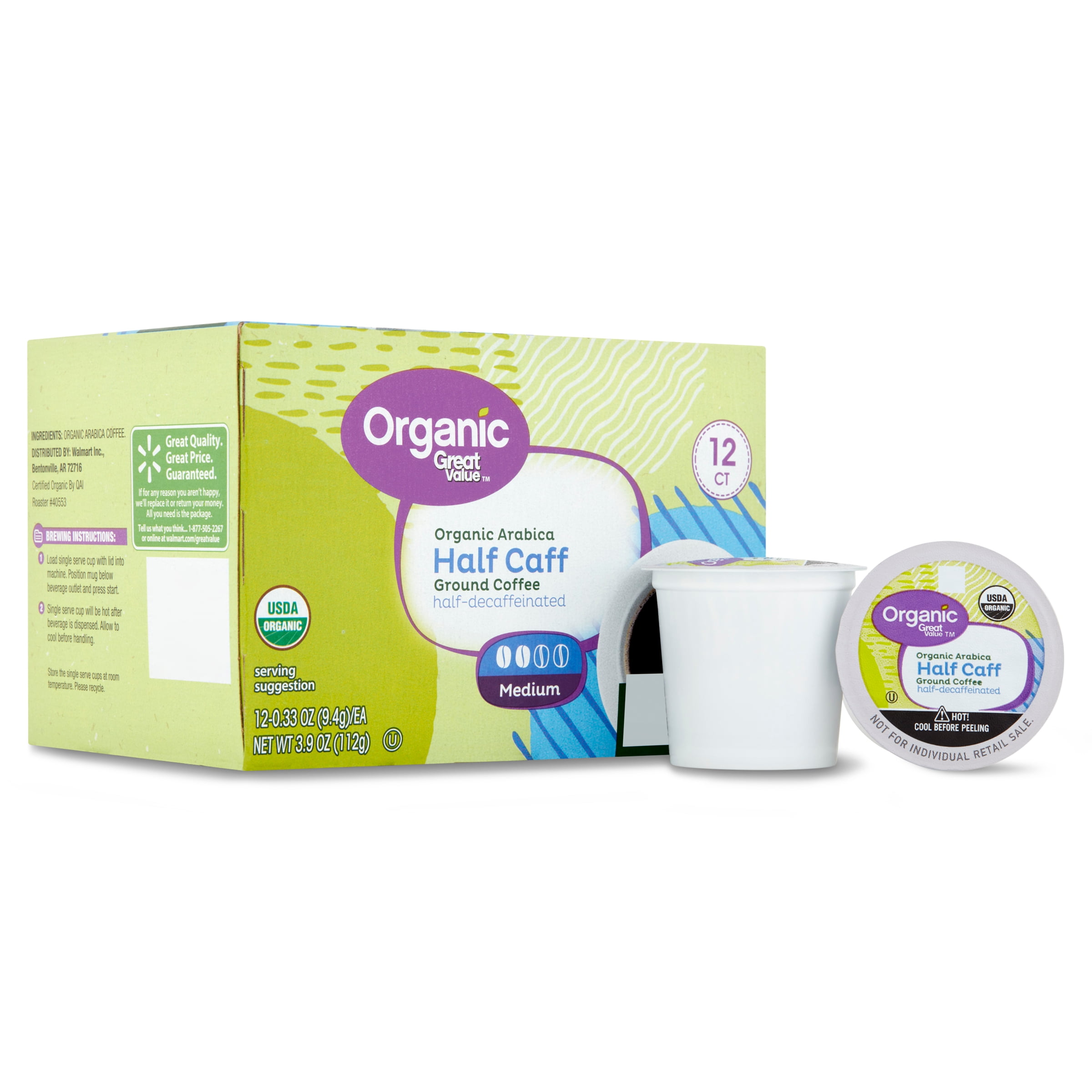 Great Value Organic Arabica Half Caff Medium Roast Ground Coffee Pods, 12 Ct