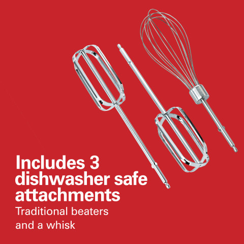 - INCLUDES COMPLETE 3 PIECE ATTACHMENT SET: The Hamilton Beach hand mixer includes everything you need to start mixing. It comes with 2 dishwasher safe traditional beaters and a whisk. All the accessories store neatly in the snap-on storage case.