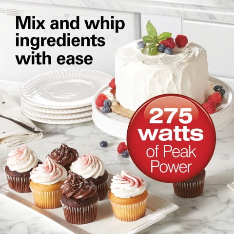 - MIX AND WHIP INGREDIENTS WITH EASE: With 275 watts peak power, the hand mixer easily mixes and whips the ingredients for your favorite recipes, whether you’re adding heavy ingredients like nuts to cookie dough or making light, fluffy meringue for a pie.