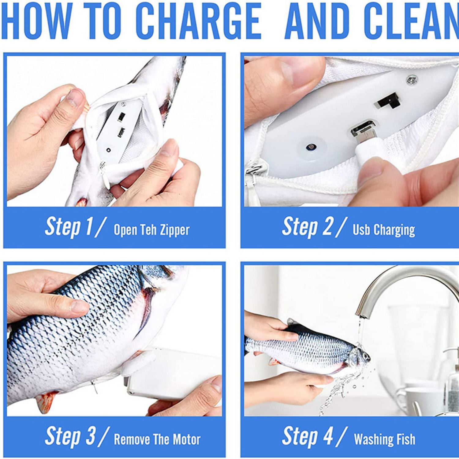 - USB Chargeable: this toy is USB chargeable which saves you from the hassle and costs to replace batteries. USB cable is included in the package. The included chargeable motor is detachable for convenient cleaning of the plush toy. Use Instructions: Unzip the fish belly, flip the switch on, and then tap the fish belly to make the fish flop; When charging, the red light comes on; When fully charged, the red light goes out