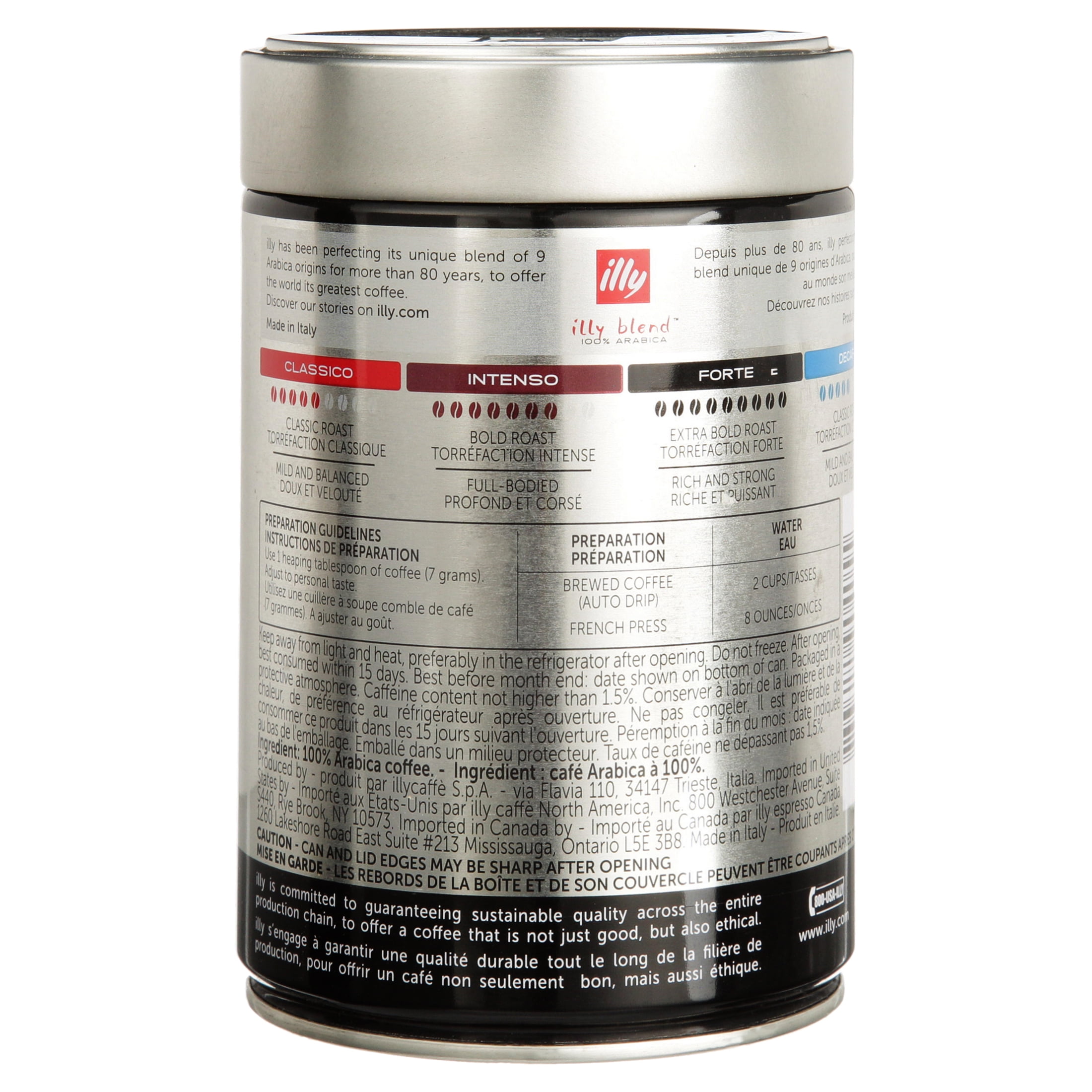 Introducing illy extra dark roast coffee – now even bolder. The beautiful taste of illy is celebrated the world over as the pinnacle of what coffee can be. Savor the distinctive illy blend in Extra Dark – roasted slightly longer to deliver an intense body and extra bold, never bitter taste with notes of dark chocolate and caramel. Our unique blend is composed of the finest 100% Arabica coffee beans from 9 of the best origins in the world. This exceptional coffee is dark roasted to perfection and expertly ground for drip coffee makers and French press. Using an exclusive process, illy coffee is packed in an air-free, pressurized can that enhances and seals in the precious aromas and oils, so you enjoy the freshest taste – cup after cup. A lot of hands help to make illy coffee – so illy is committed to giving back to every single one; creating a cycle of quality and consciousness for all. Over 25 years ago, illy pioneered the direct trade model by cultivating personal, long-lasting relationships with growers in order to produce the best of the best beans. illy provides hands-on instruction to growers all over the world – helping them to develop skills, techniques, and stay up-to-date on innovations in sustainability, at no cost to them.illy Ground Drip Extra Dark Roast Coffee, 8.8 Oz