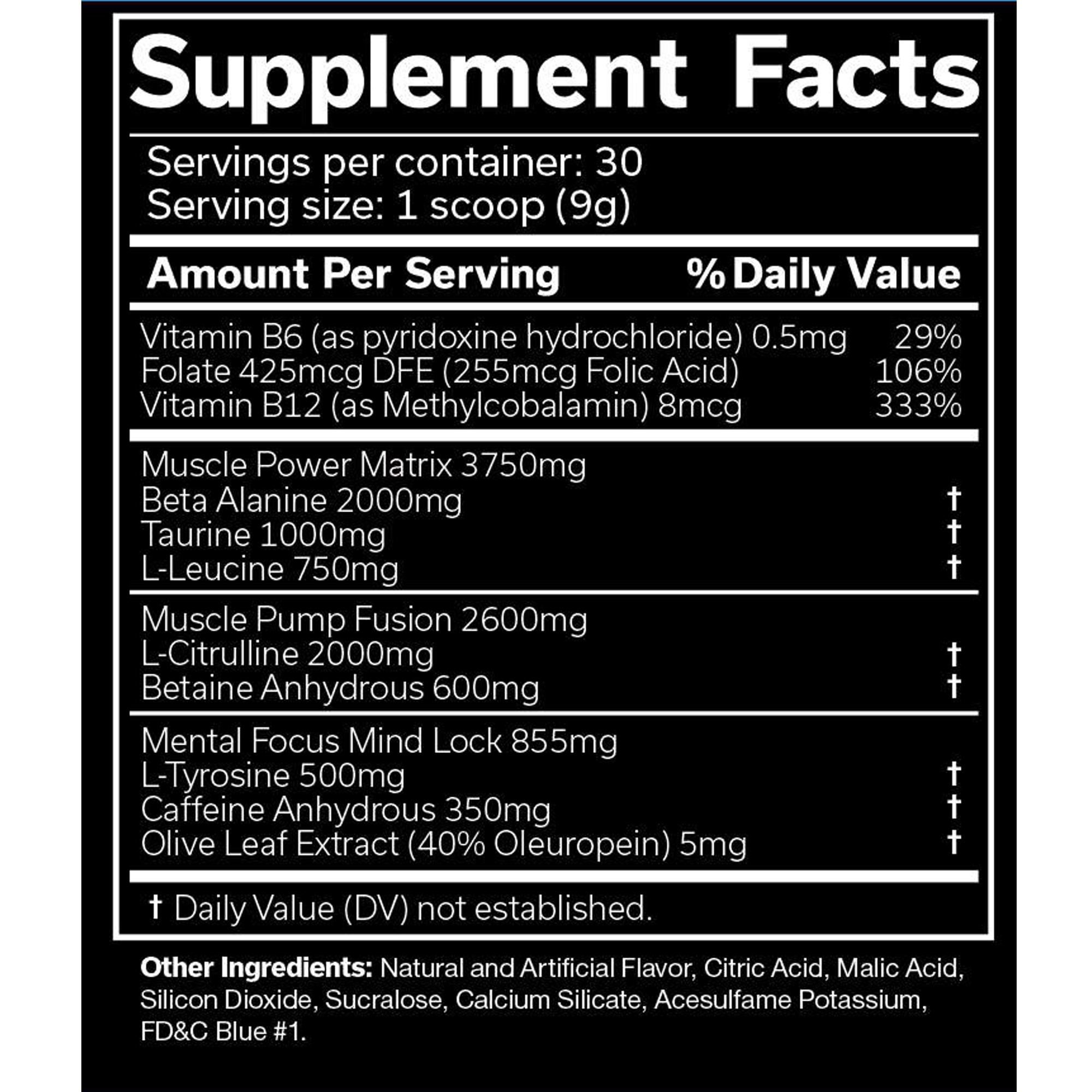 The Shadow!® is a mind blowing pre-workout designed for hardcore users only. Just 1 scoop of The Shadow!® will put you in a workout zone unlike anything you’ve ever experienced. Mind lock mental focus, intense muscle pumps and savage training intensity. The Shadow!® will take you further than you’ve ever been before…* WARNING: Always assess your tolerance with a single scoop. This product is only intended to be consumed by healthy adults 18 years of age or older. Not for use by those with pre-existing medical conditions or those taking any medications, young children under the age of 18, pregnant or lactating women, or individuals sensitive to caffeine or beta alanine. Discontinue use and consult your health care professional if you experience any adverse reaction to this product. To avoid sleeplessness do not consume within 4 hours of bedtime. You may experience harmless short-term skin tingles. Do not use if safety seal is broken or missing. KEEP OUT OF REACH OF CHILDREN Store in a cool, dry place. Contents sold by weight not volume. See bottom of container for "best before before" date. Produced on equipment that also processes peanuts, tree nuts, milk, egg, wheat, shellfish, fish, soy. Directions Mix 1 serving (1 scoop) with 7-10 ounces (200-300mL) of cold water 15-30 minutes before exercise. Read warnings before use. Full strength formula: Do not exceed 1 serving (1 scoop) in any 24-hour period.350mg of caffeine per serving, 100% transparent labeling, 2000mg Beta Alanine per scoop