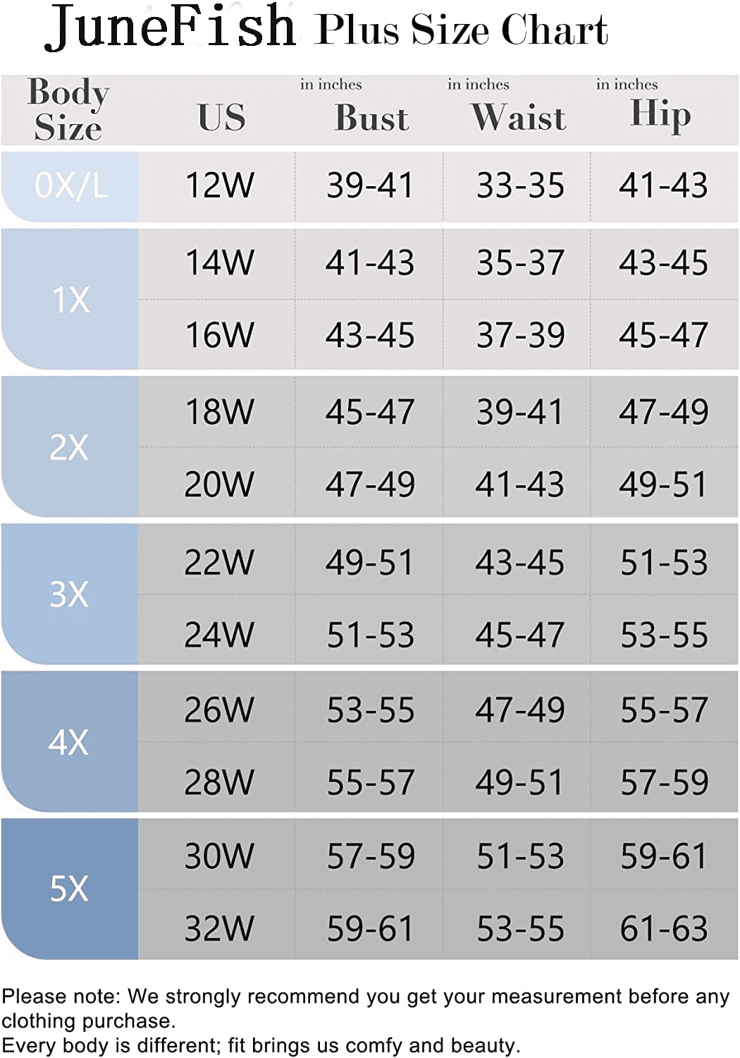- 【Standard US Plus Size】: JuneFish specializes in designing clothes for Plus-Size women. We adopt the most common US Size Standard so that you can buy clothes in the correct size easily. 0X/L=(US 12W), 1X=(US 14W-16W), 2X=(US 18W-20W), 3X=(US 22W-24W), 4X=(US 26W-28W), 5X=(30W-32W).