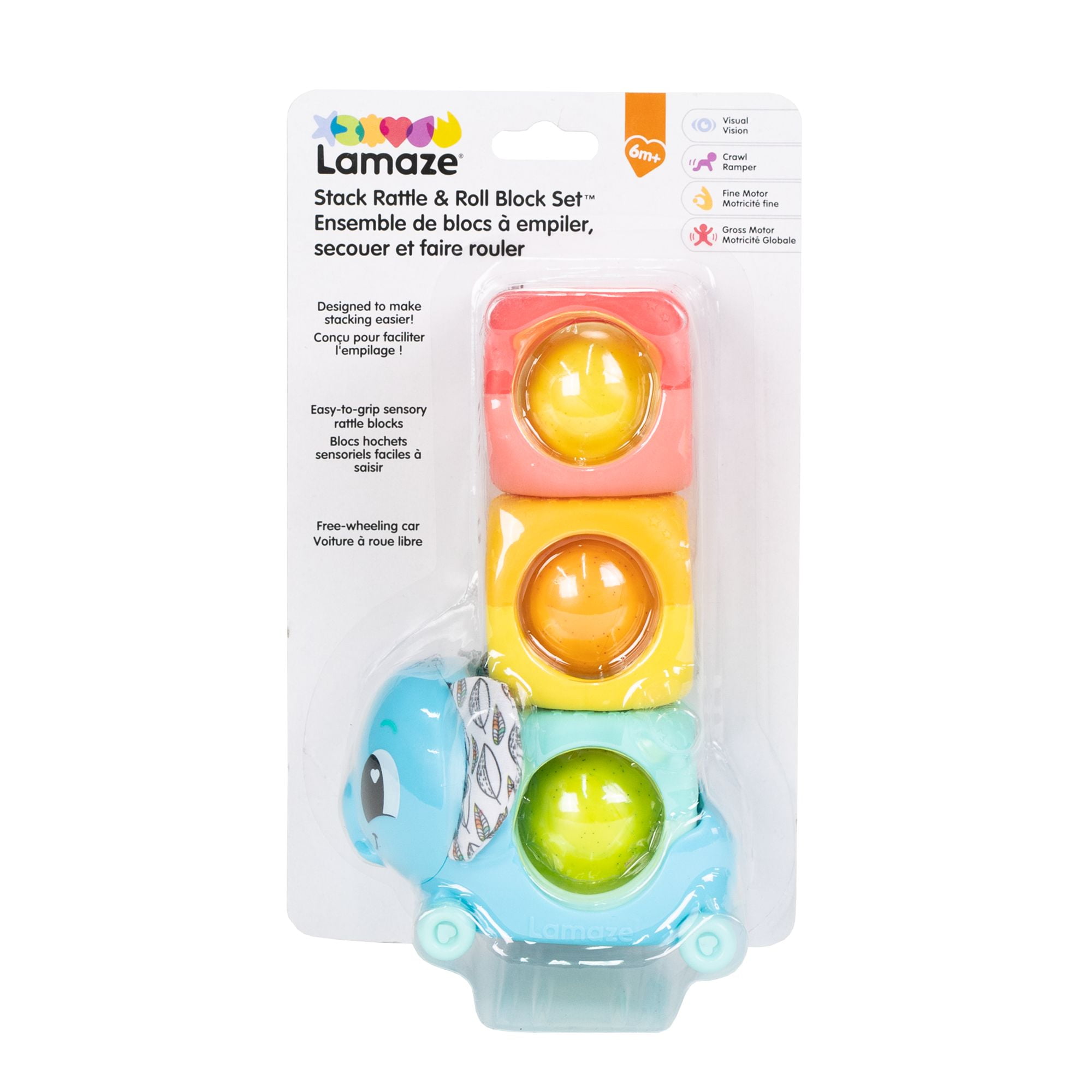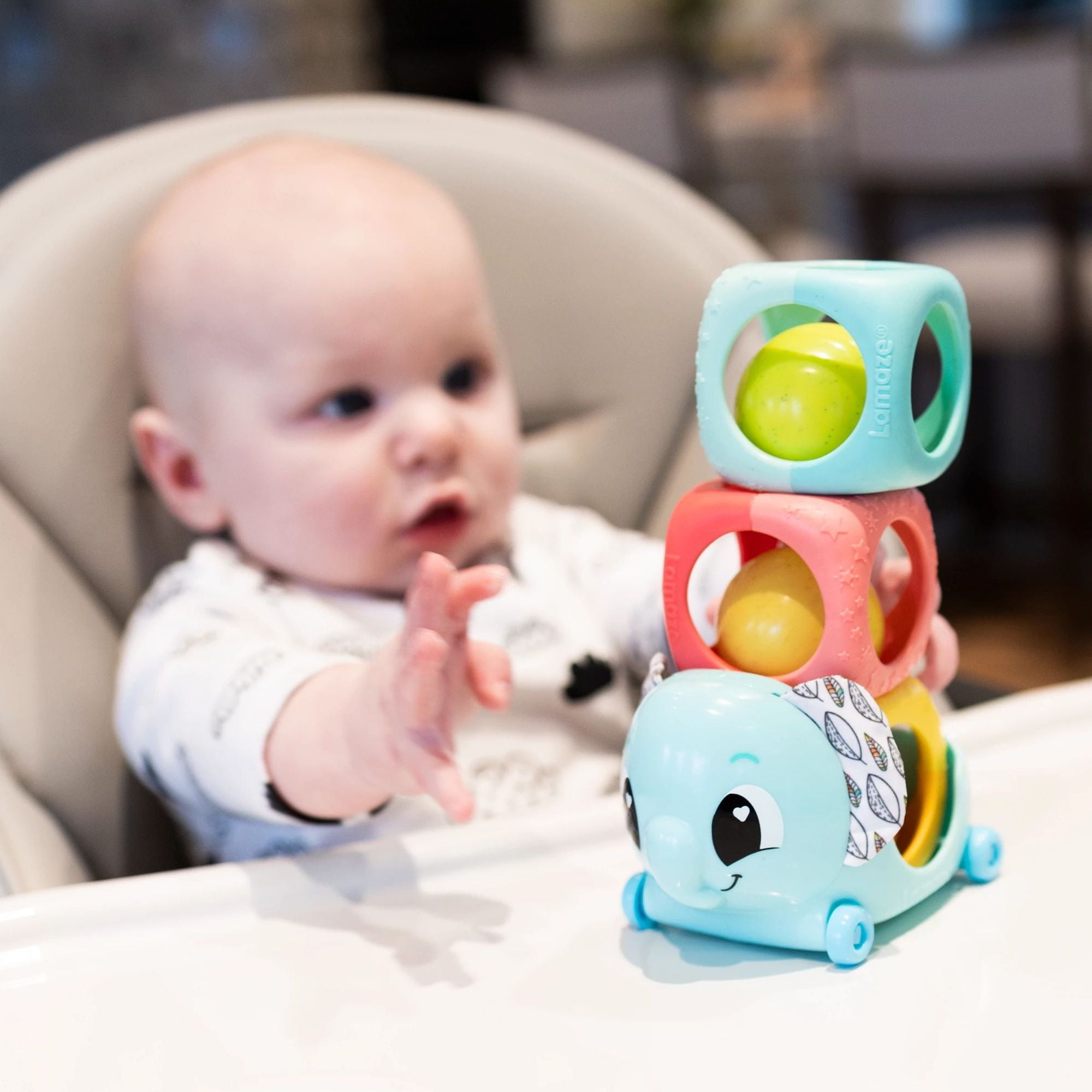- A perfect first stacker for baby! Each squishy cube has a rattling ball inside for easy stacking