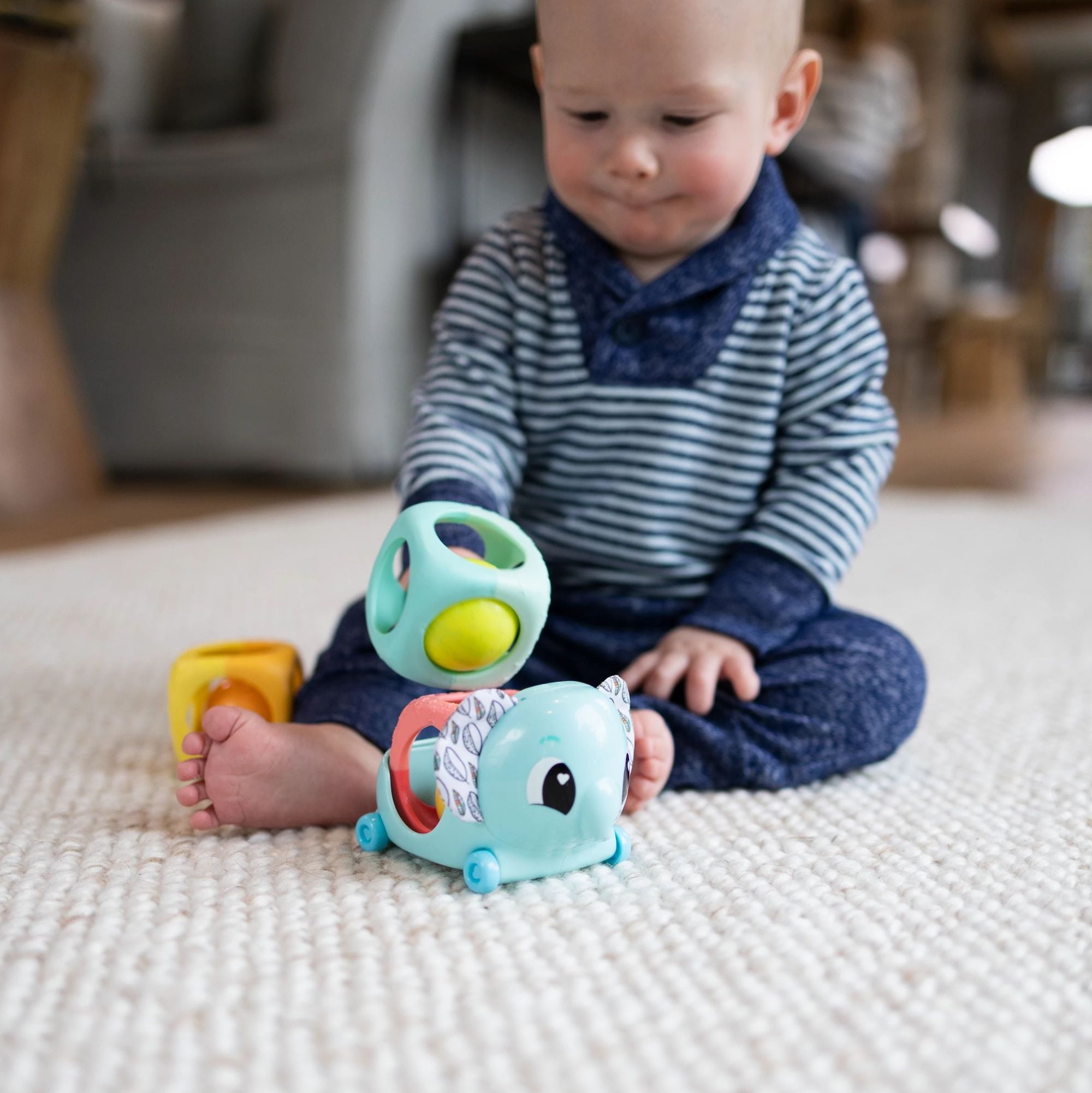A perfect first stacker for baby! Inside each cube is a ball that rattles. But it does more than that! As little ones stack the cubes onto the elephant roller and onto each other, the weight of each ball aligns them and holds them in place. No tears. Just happy discoveries!