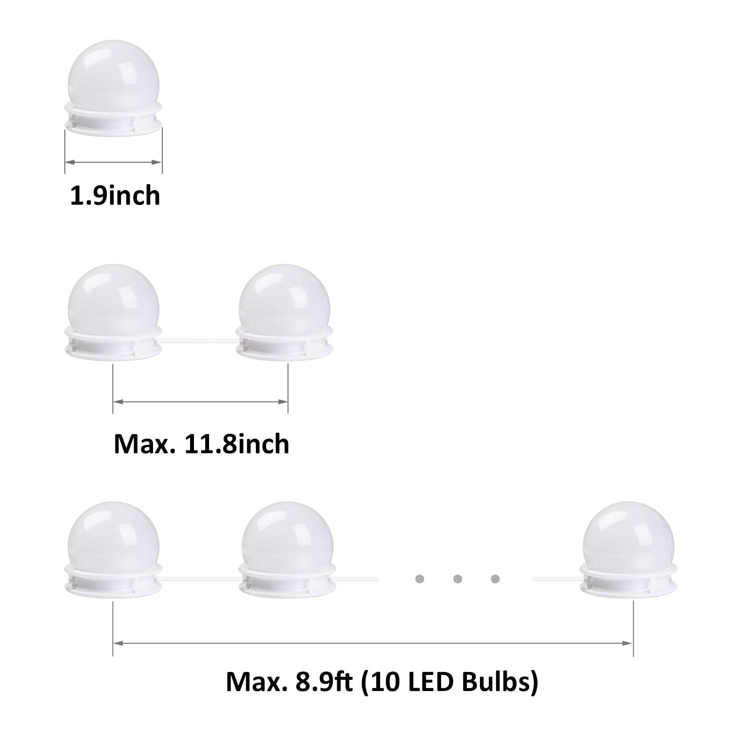 ☛ Easy to Install – Multiple uses vanity light is easy to install, it can be stick on mirror, frame or wall directly. - ☛ Length – The total length of the light kit is 15.4ft, and the longest length between 2 bulbs is 11inch.