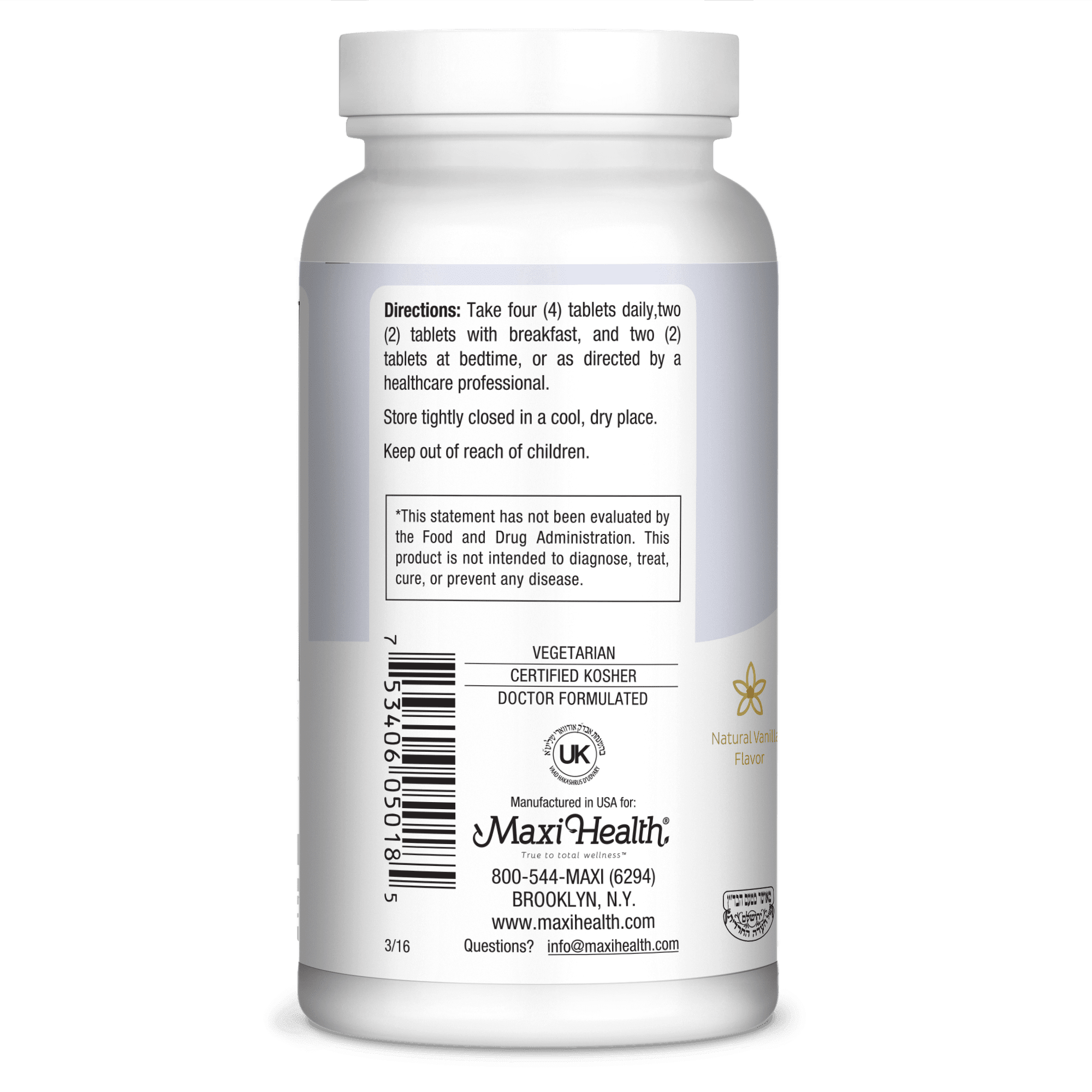 Chewable Calcium Complex is the perfect supplement for those who prefer to take their calcium with Magnesium. It’s chewable and it has a great vanilla taste. Calcium is the most abundant and possibly most vital of all nutrients. Calcium loss is constant as the body carries on its daily functions. We all know that the bones need calcium but did you know your bones are alive. The material making up the bones is being replaced on an ongoing basis throughout your life! This is called remodeling. If remodeling does not occur according to its natural cycle, fractures and misshapen bones can result. In addition, calcium is essential for the contraction of muscles, conducting nerve impulses, and enzyme activity. Magnesium is required for so many things, what better time is there to take it if not with your calcium. Chew your way to getting the calcium and magnesium you seek with delicious vanilla Chewable Calcium Complex! Our uncompromising commitment to quality begins with selecting the finest raw materials from across the globe, to high standard manufacturing practices in GMP Certified and FDA registered facilities, in the USA. All Maxi Health products are certified kosher, under the Orthodox Union (OU) and the Advair Kashruth (UK). Legal Disclaimer: These statements have not been evaluated by the FDA. This Product is not intended to diagnose, treat, cure or prevent any disease.
