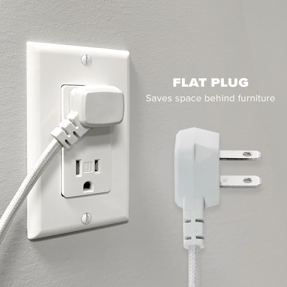 - The 9ft cord allows for an extended reach for outlets while the flat plug allows for furniture and media to sit closer to the wall.
