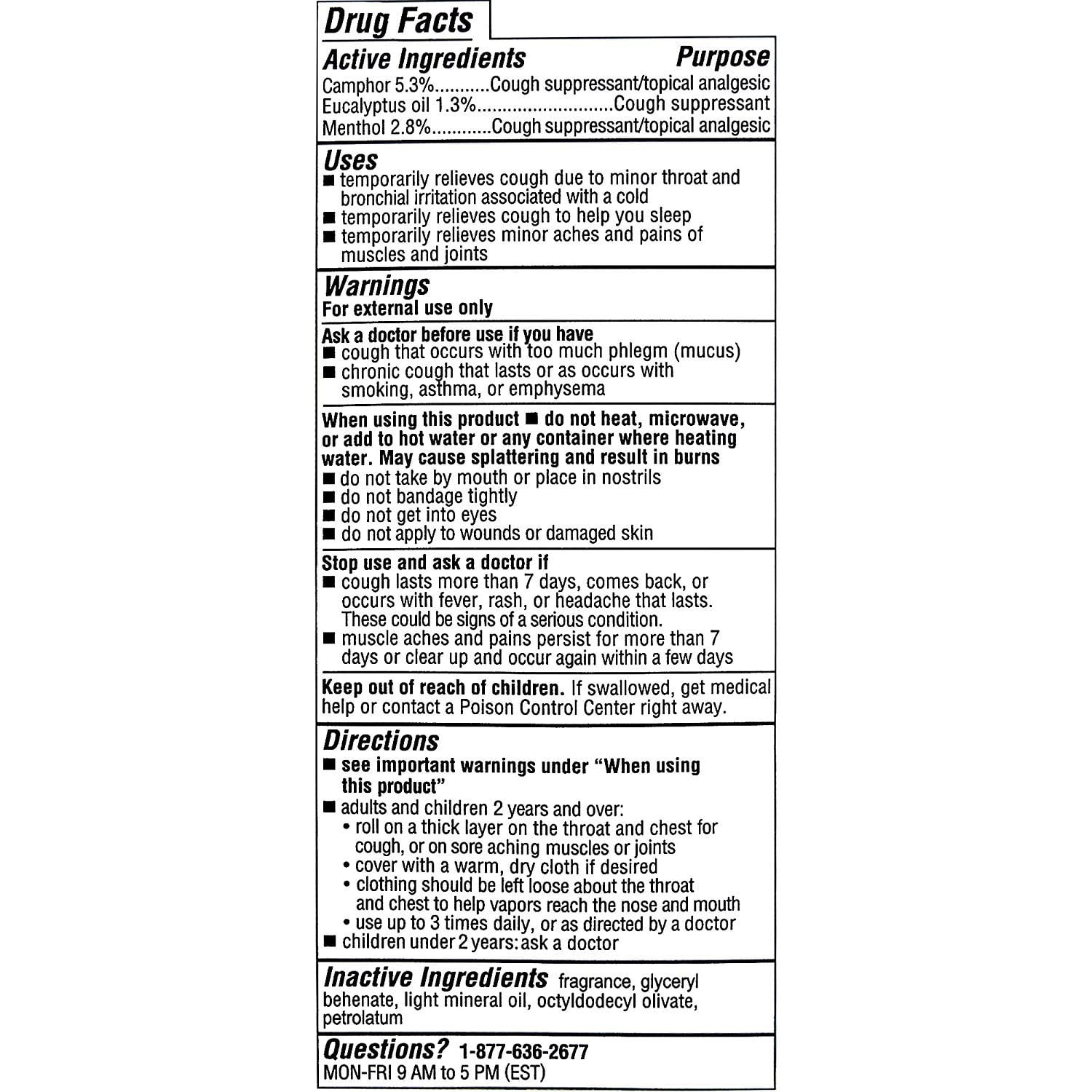 Mentholatum No Mess Vaporizing Rub with 100% natural active ingredients delivers camphor, eucalyptus oil, and menthol in a convenient mess-free bottle with a roll on applicator, so hands stay clean. Formulated to provide maximum strength cough relief, Mentholatum No Mess Vaporizing Rub when applied to the throat and chest works fast to temporarily relieve cough due to a cold, helping you go about your day or sleep through the night. Its penetrating formula plus massaging action of the roll on applicator also help to relieve minor aches and pains of muscles and joints.Mentholatum Vaporizing Rub Roll On: